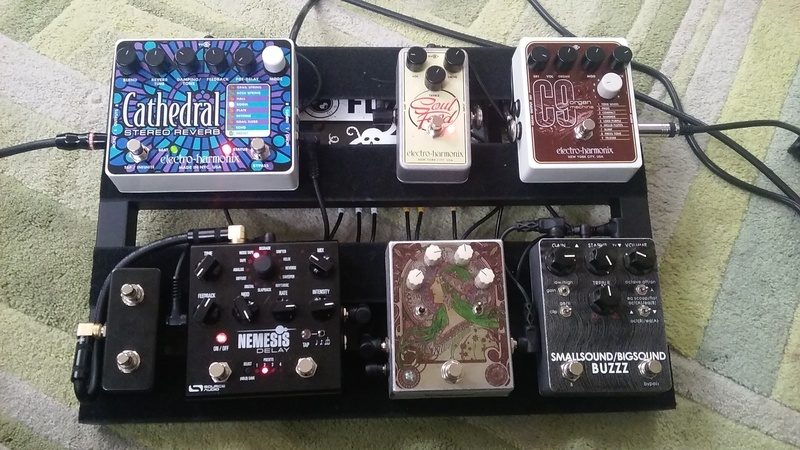 The big gap next to the whammy is a placeholder for my replacement 4046m whenever that's ready. The line selector under the ct5 is to route the 8step to either the ct5 or PS3, the big black mammoth clone above the t-resonator is a placeholder (size wise) for a stereo bypass looper for the t-resonator that Tom at wee lush is building me, with two switches to bypass the left/right inputs seperately. Grey box under the ms50g is tap tempo for the dd7. Ditto x4 is now off board as my looping is completely midi sequenced so no need to have it on the floor.