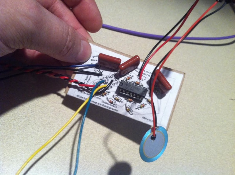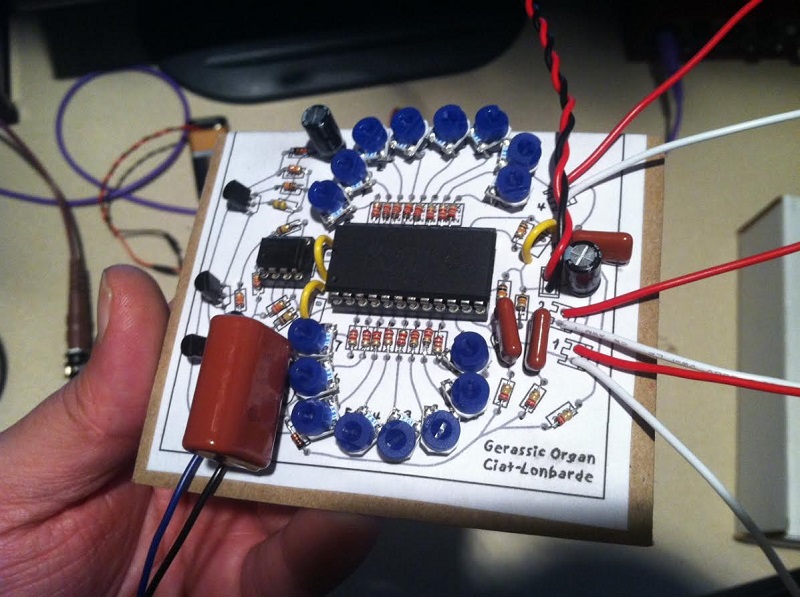 finished another Gerassic Organ, used a 4.7uf poly for them subbubbass tones. also built the Ciat-Lonbarde blackgroundcorn paper circuit. has two probes and a piezo mic. mic picks up sound as expected, probes act like a continuity tester of sorts for probing through circuit boards etc and you can modulate the resulting triangle wave signal by manipulating the piezo disc. pretty neat