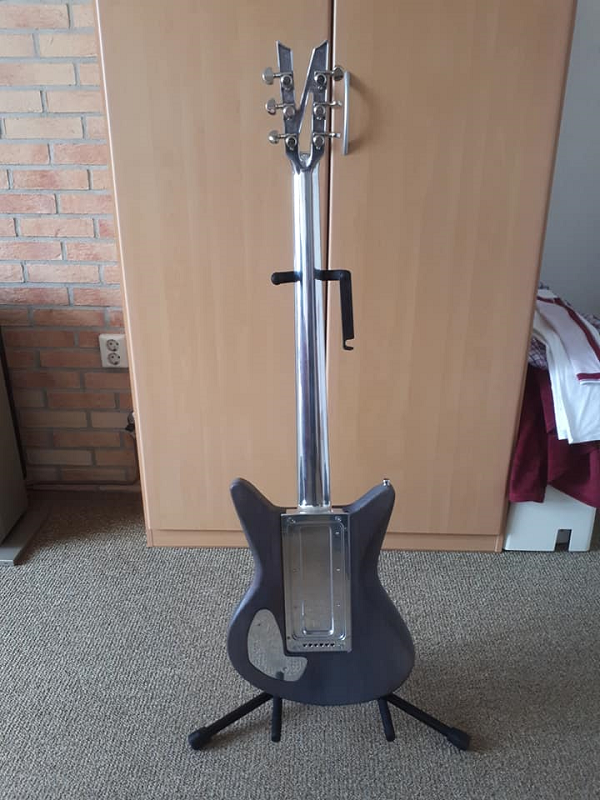 During the process Gabo and I had a lot of contact, and so we deviated from my envisioned specs somewhat, but to good result! It has a great tone, the aluminium really gave me what I was looking for and the Bare Knuckle pickups are awesome as well. We abandoned the dual output idea because it proved to be too complex electronically for 3 pickups without risking dropped output from splitting too much internally without a buffer. The colour is also something different, which I like, it looks different under different lights and that just adds to the mystique. Went for a ceramic BlackHawk instead of the alnico model as well and it sounds great in the middle position.