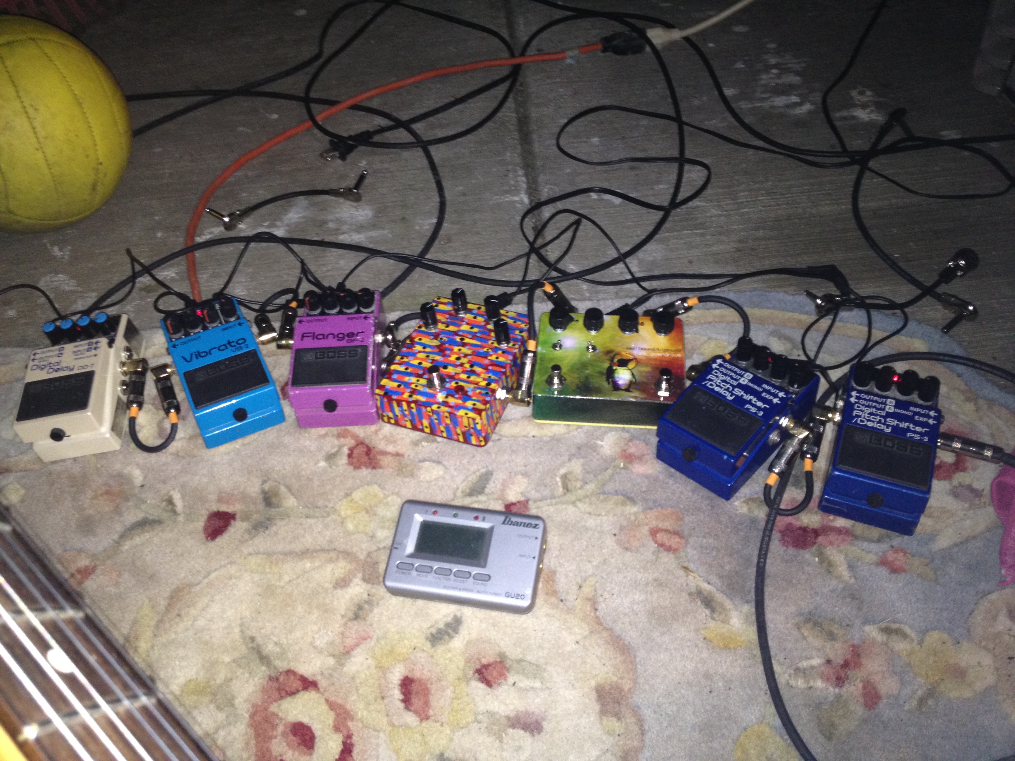 Hope the picture isn't too big. :idk: So here is my board, if you will, which is just kind of just thrown across my garage floor on a rug because I am too poor for a proper pedalboard (The VB-2 was a gift so I didn't spend all my money on that!). Even though it is mostly boss, I love the the ambient sounds I get out of it. Both of the PS-3's make sexy, shimmering heaven noises, and I get warbles and whooshes with my other pedals; too bad I don't have a way to record...