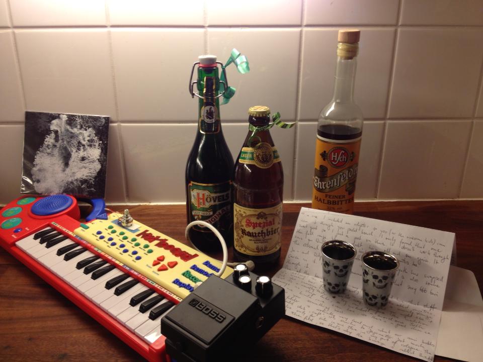 A toy turned into a noise instrument, nice Jägermeister style (but a lot finer stuff) semi-bitter, schnapps glasses to go with it, some really tasty rauchbier from Germany, and some fantastic drony-droning!