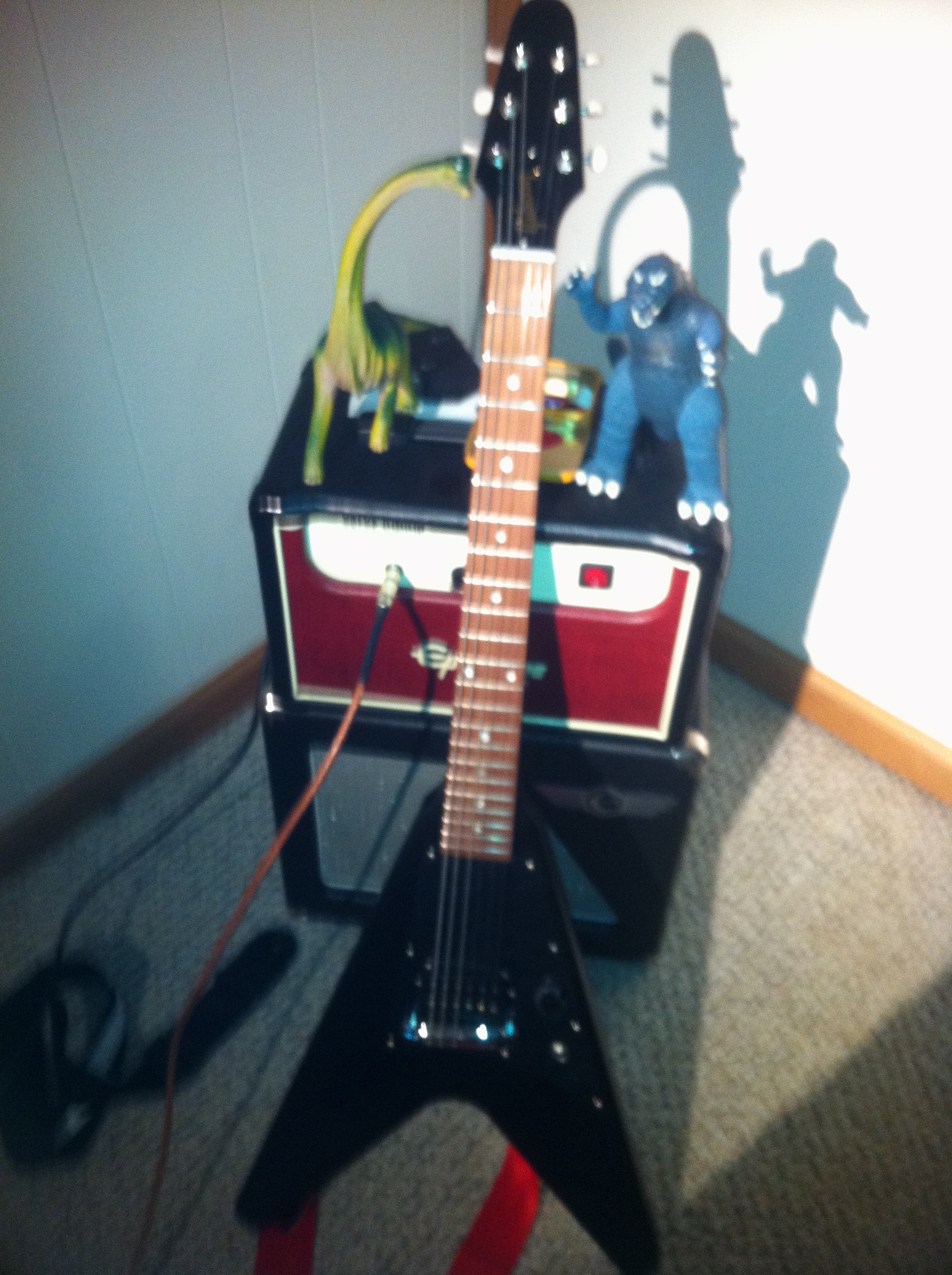 My Epiphone Valve Jr. head atop a cabinet that my hippy friend Gerald recycled from a dead Epiphone Galaxie 10. Not spectacular, but a good platform for copious amounts of fuzz. Loud enough to make my wife yell at me down the laundry chute. Guitar is my Gibson Melody Maker Flying V. Godzilla and Bronto are for M0J0 TOANZ.