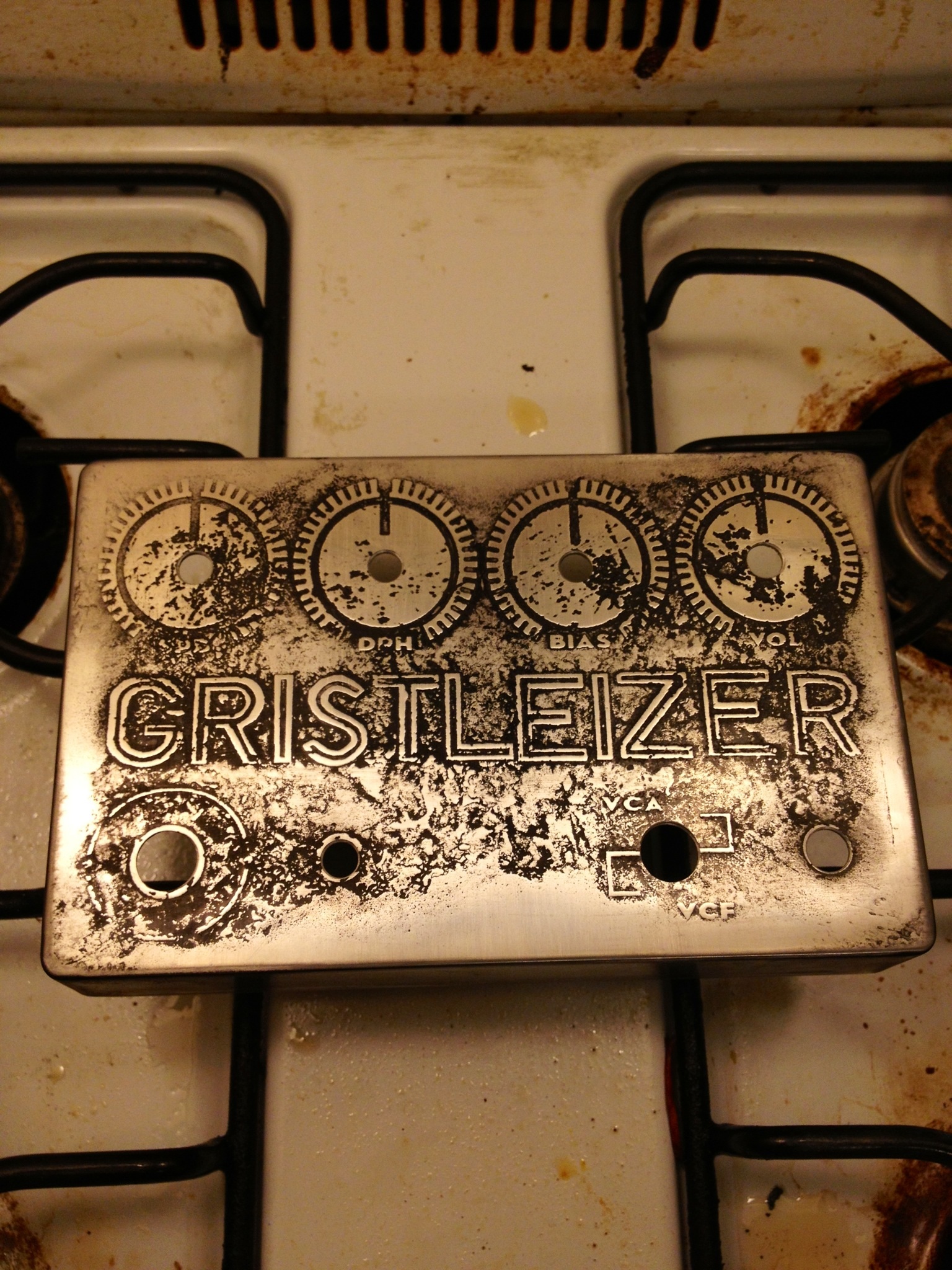 Finally, replacing my old Gristliezer. Like this finish but the old one was better! I use the oven vent to cure the paint and clear coat. There's fried chicken grease everywhere from earlier today.