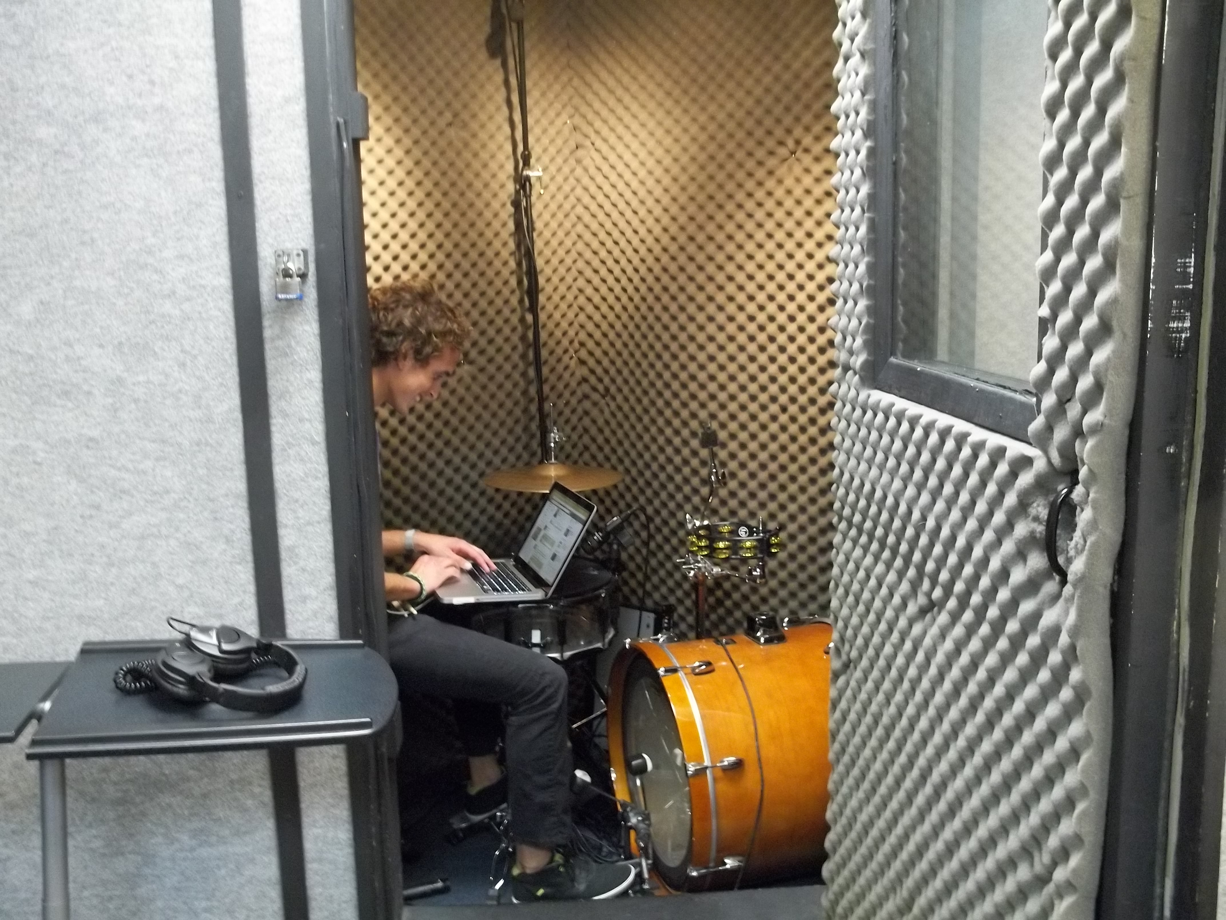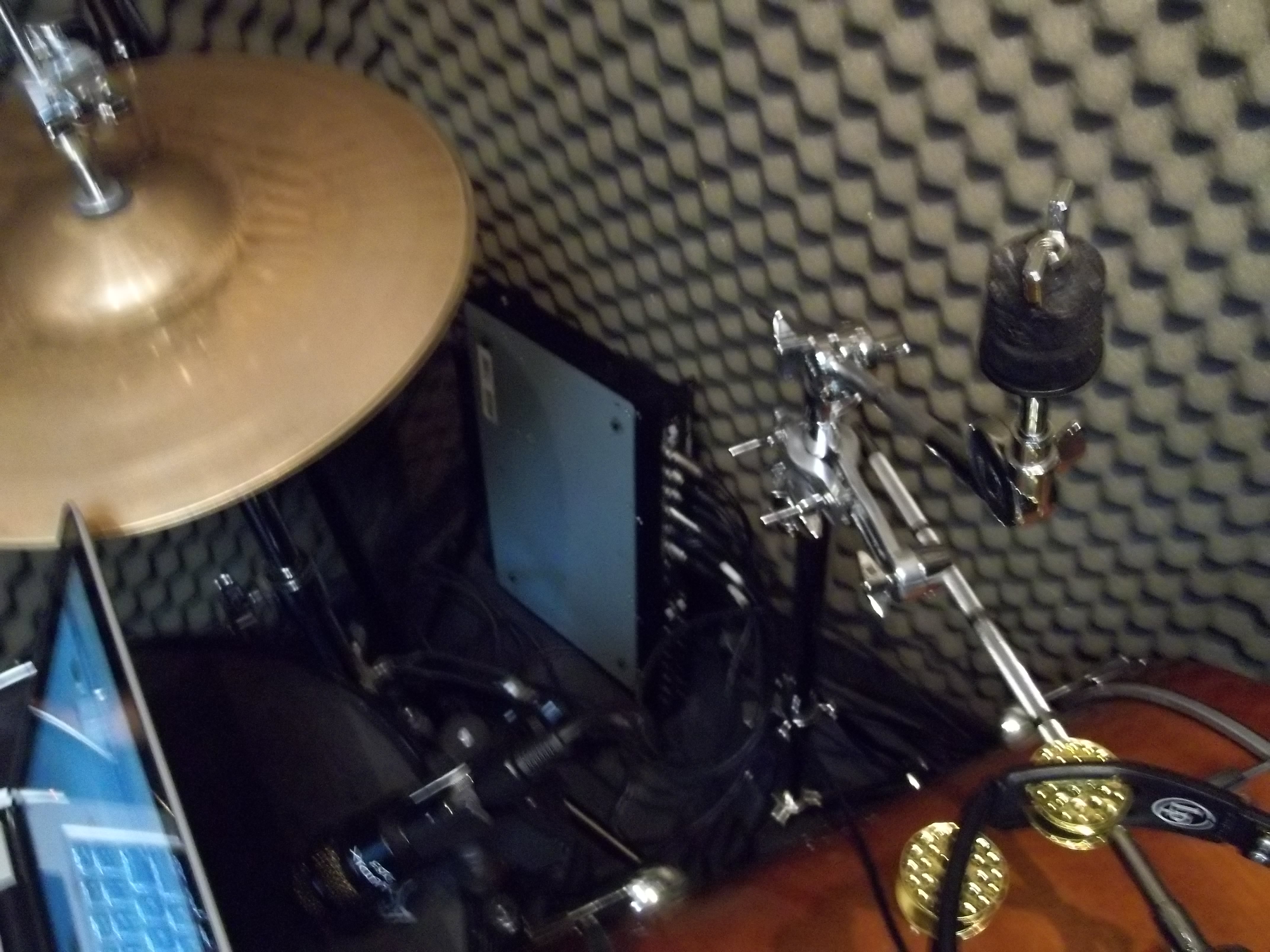 The interface went on the ground as you can see, the computer went behind the drum throne on the ground, I went ts in through a panel and then into the interface. We used a y-cable to go ts out of the iso booth through the panel, out to my headphones. I'm still editing and mixing, but dry everything sounds really good. The deadness of the room mixed with the ambience of he overhead mics has a really nice sound.