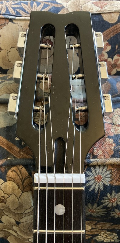 the pickups are the whole point of the enterprise. they're repros (to an extent) of the Davoli pickups used on Wandré guitars. the Soloist comes with a single coil neck pickup and what they call a "Single Twin" bridge pickup with two coils, each reading 3 strings. the Single Twin design isn't OG Davoli (as far as i can tell; alert me, o reader!) but it gets in the ballpark. the contrast between the rather subdued neck PU and the snappy bridge PU is striking; it's a bit less pronounced since i got the D'Addarios off and my preferred Regular Slinkies on. i'll probably micro adjust the pickups for another couple of days yet because that's what i always do with a new guitar.