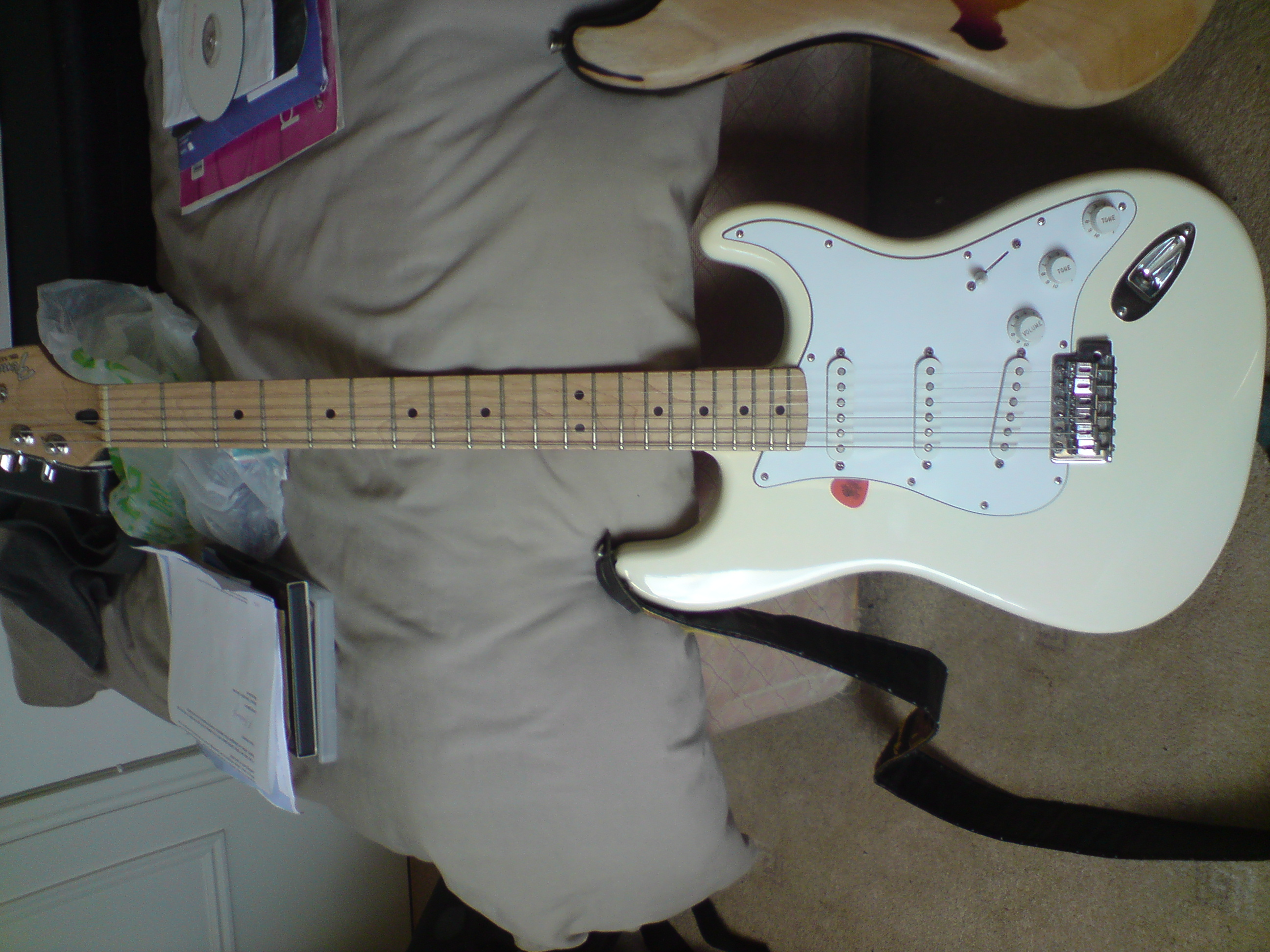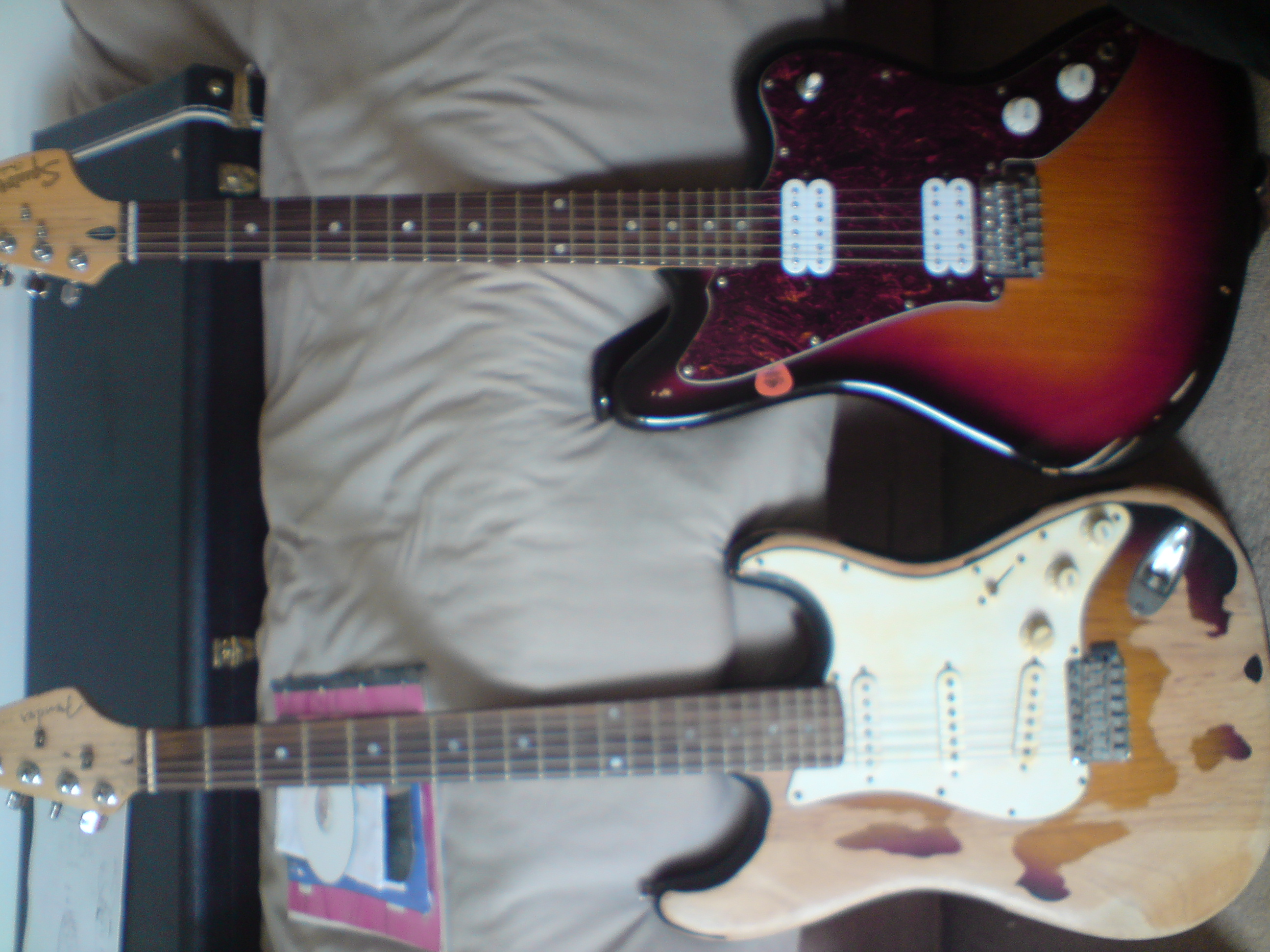 White mexi strat, beaten up jap strat, squier jagmaster. don't own the jaguar anymore :(