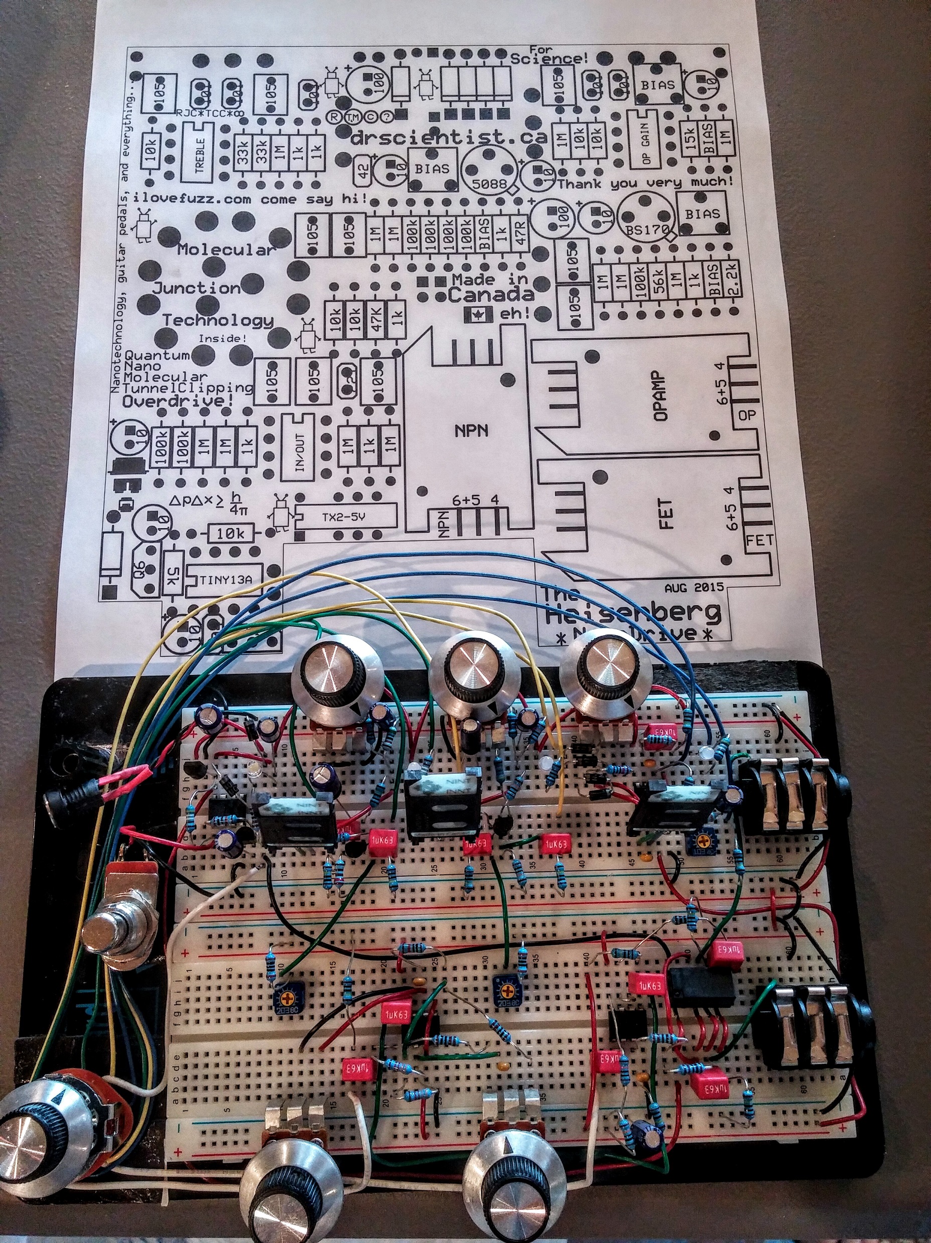Ok, since my last post in here we've gone back to having 3 junctions for the Heisenberg. 1 no-dot junction for the op amp stage and 1 red-dot junction for each transistor stage. Then you get the best of both worlds, the ultimate molecular junction pedal, no holds barred! The Heisenberg will be similar to the big NINT prototypes in that they'll be great for experimenting. Every amplifier is socketed, the junctions are socketed, and I'm experimenting with including bias trimpots for each stage too so a person could conduct many experiments should they so choose.