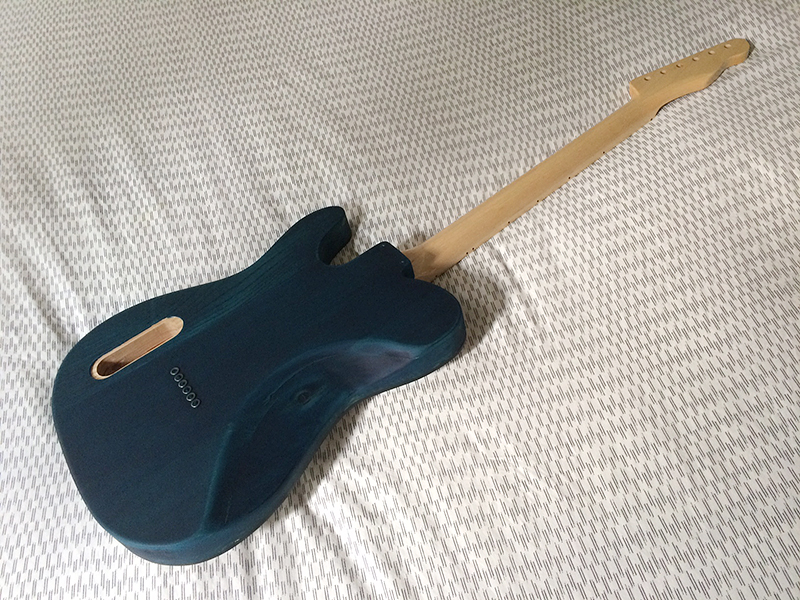 Working on this Telemaster right now. weed_killer made the body out of gym bleachers and scrap lumber. The neck is a custom order from USA Custom Guitar. The top is painted with thin coats of Minwax white tint stain base, and the back is stained with water based Speedball screen printing ink. And everything's getting coated with Birchwood Casey Tru Oil. (I liked the multiple plank vibe of the body, but wanted to tone it down a bit visually, so I did thin coats to let some of the grain and seams between the multiple pieces of wood still show through.)
