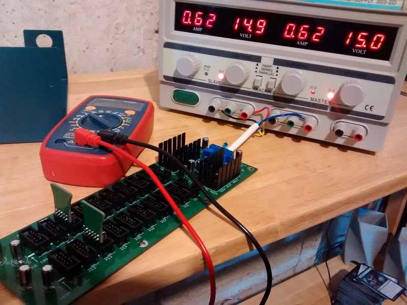 matte black PCB panels. I made a matrix mixer, a joystick, a 2HP multiple. I have in the works a dual analog comparator module with extra features. designing a power supply module and a powered bus board was a huge deal because I had to make a lot of special equipment for loading and probing power supplies under controlled conditions. this is not even all of the stuff I have for power supplies. I have more PCB for power testing stuff.