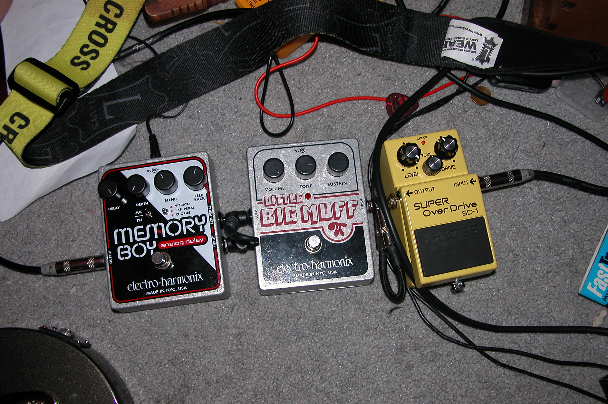 white curly cable > PEwaves tuner > mellowtone singing tree > dba interstellar overdriver deluxe > boss ps-3 > boss re-20 > ehx cathedral > ehx smmh > boss rc-20xl > amp (sovtek mig50 w/ avatar cab or old beat up fender blues deluxe)