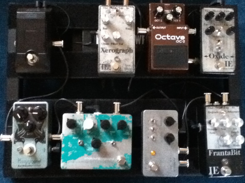 with it. It lets me use something that needed a true bypass looper at the very least -- my old Dano slapback-y echo-y reverb -- and I can use my cheap Joyo Ultimate Drive to give the signal a little more gain after the reverb. I leave the Dano reverb on all the time with the reverb turned all the way up, and I can turn the Joyo OCD clone on and off as necessary. Plus, the momentary feedback loop makes some really nice noise blasts -- which I can dial in to sort of be an EHX Freeze style repeat if I want. Play a note, stomp on the feedback switch, and I can stop playing and maintain the note for as long as necessary.