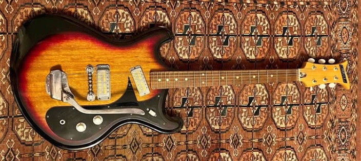 Teisco (Heit badged) Mosrite copy with gold-foil pickups. i’ve never seen one of these before, and i’ve seen a LOT of Japanese guitars. dig the German carve! and the knockoff Gretsch Space Control bridge!