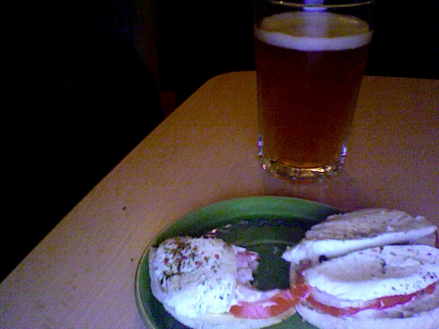 2;30 am:mozarella w/ tomatoes and spices on a english muffin and paulaner