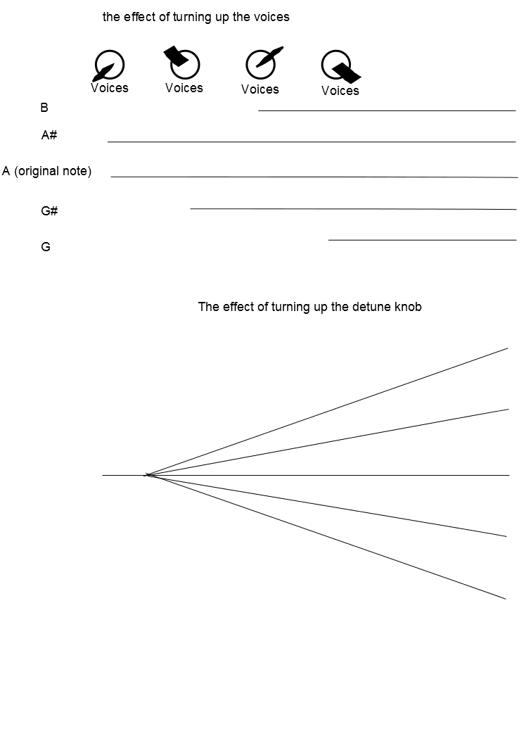 The detuning is proportional, like a whammy pedal or pitch shifter pedal, so if you shift up one semitone when playing a low note, that will still give you a semitone shift on high notes. The highest shift amount is several semitones, so you can get some huge tone clusters if you're into that kind of craziness. :) But it can also go down to zero shift, so anything from slight thickening to massive weirdo chords-from-a-single-note are possible. To make it easier to describe, I'm imagining that you have set the detune knob for one semitone, but in reality this would be a pretty extreme setting, of course.