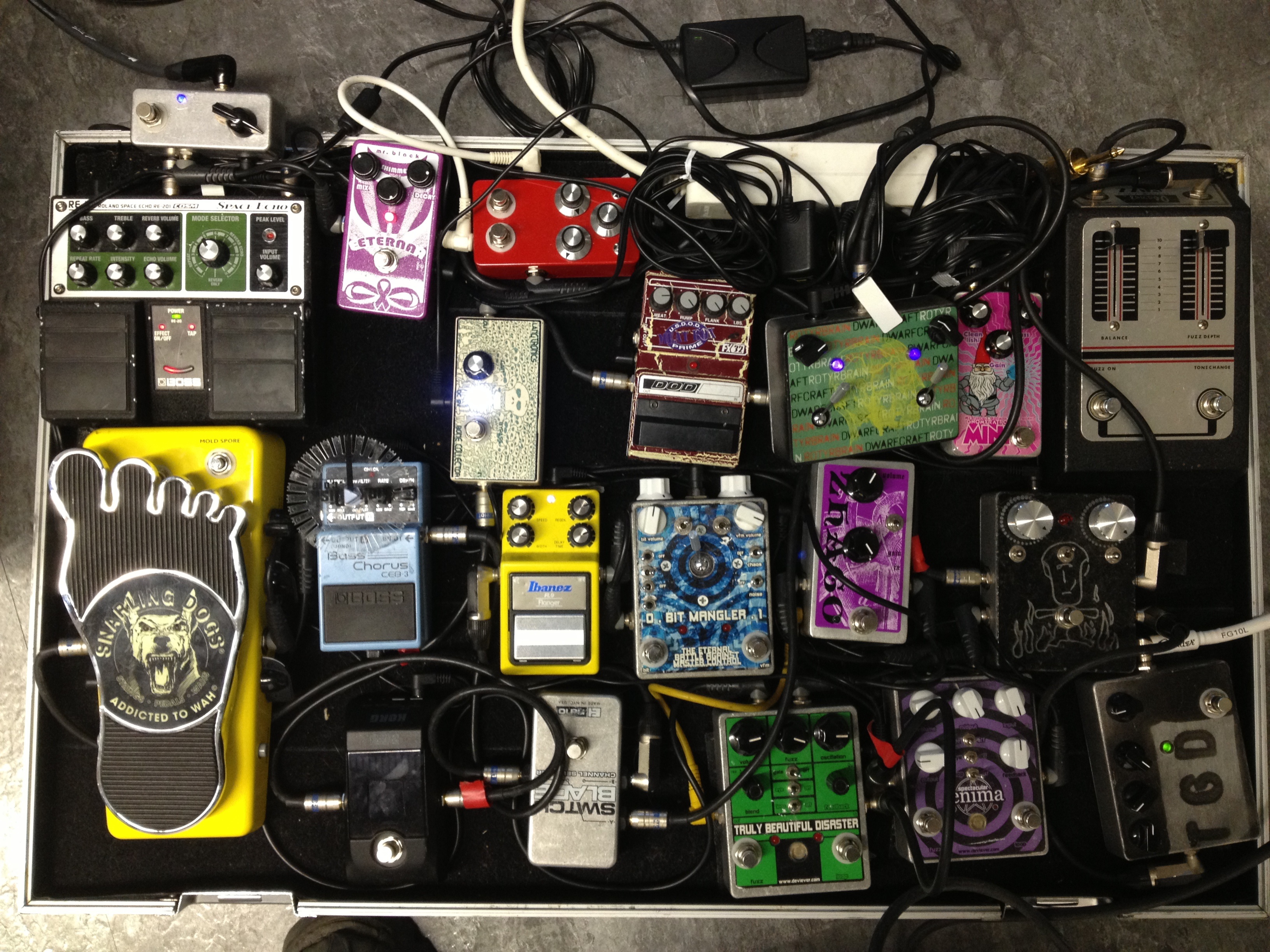 So, here is my latest rearrange on the big board. The bottom middle spot is just waiting on a pedal build that's in progress. But other than that, I feel basically satisfied with this setup.