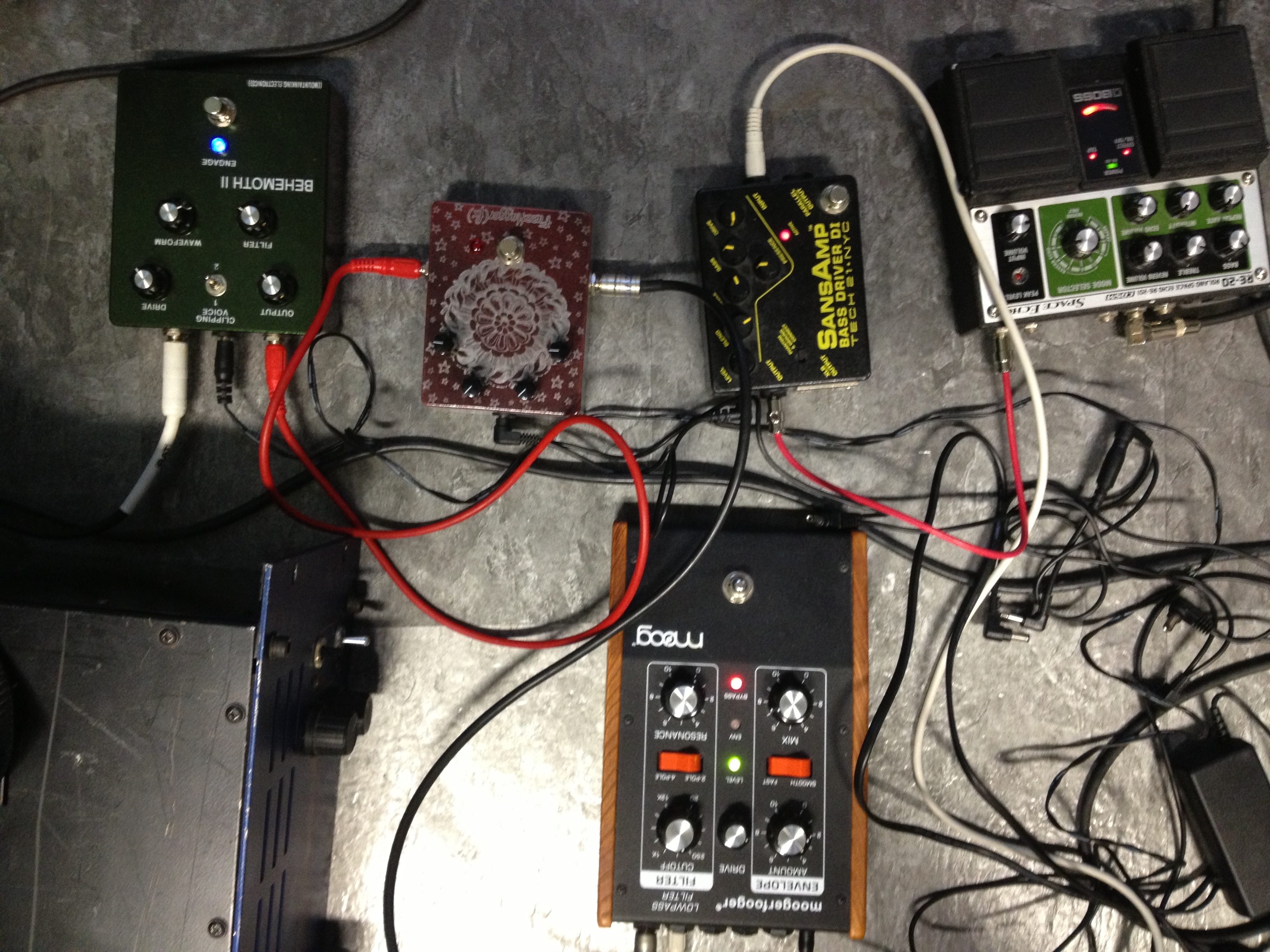 There's the Langtronics Bone Collector Envelope/Fuzz (love it especially with TGD). And the Dirge Electronics one knobber I've been rocking as the very last thing, usually boosted with something loud and fuzzy. There's still the Mom'd oscillating special fuzz (the Porche red) which is my Pink Floyd sounds going on a trip on a motorboat in a box. Yeah. Mr Black Eterna shimmer reverb which I find pretty cool not only with clean-ish bass sounds but with octave up fuzz too.