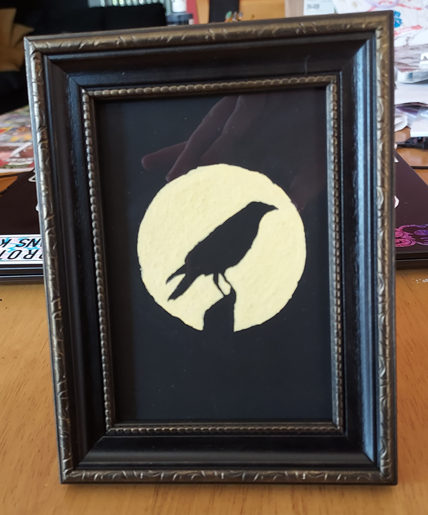 I'm trying to make more art to decorate with and not buy much new material for it, so I painted this little piece on cereal box cardboard, using a stencil I made from a tshirt design I did a couple years ago, filled in the details by hand, and repainted a thrifted frame I had in a drawer