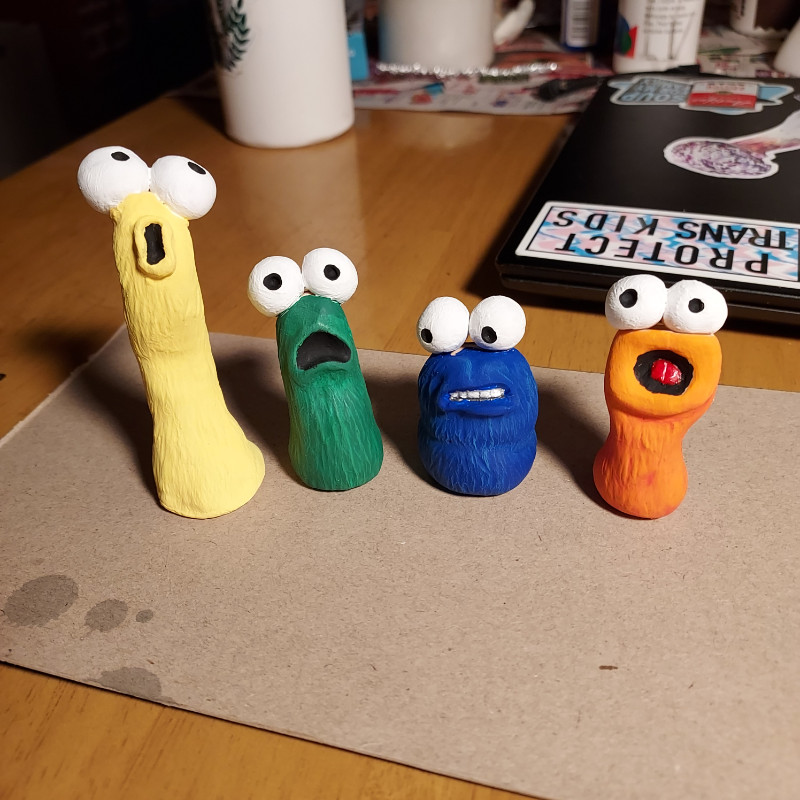 I bought a little $20 toaster oven for baking polymer clay, since my kids and I do a lot of weird little sculptures and paint them. So I made a weird little sculpture to test it out. Then I made more and they turned into a weird little collection. I might make more, if I get ideas for poses