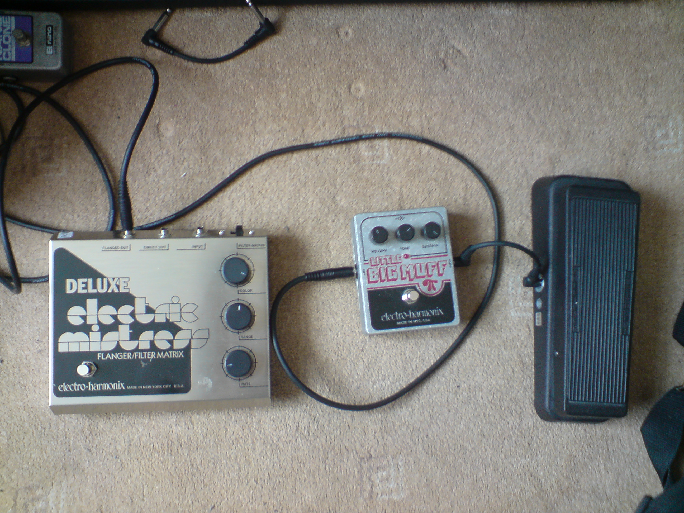 The guitar is a modified Musima Elgita. I just ruined this simple setup last week by chucking a modified (built in Distortion+ and ring mod) Electric Mistress on there too.