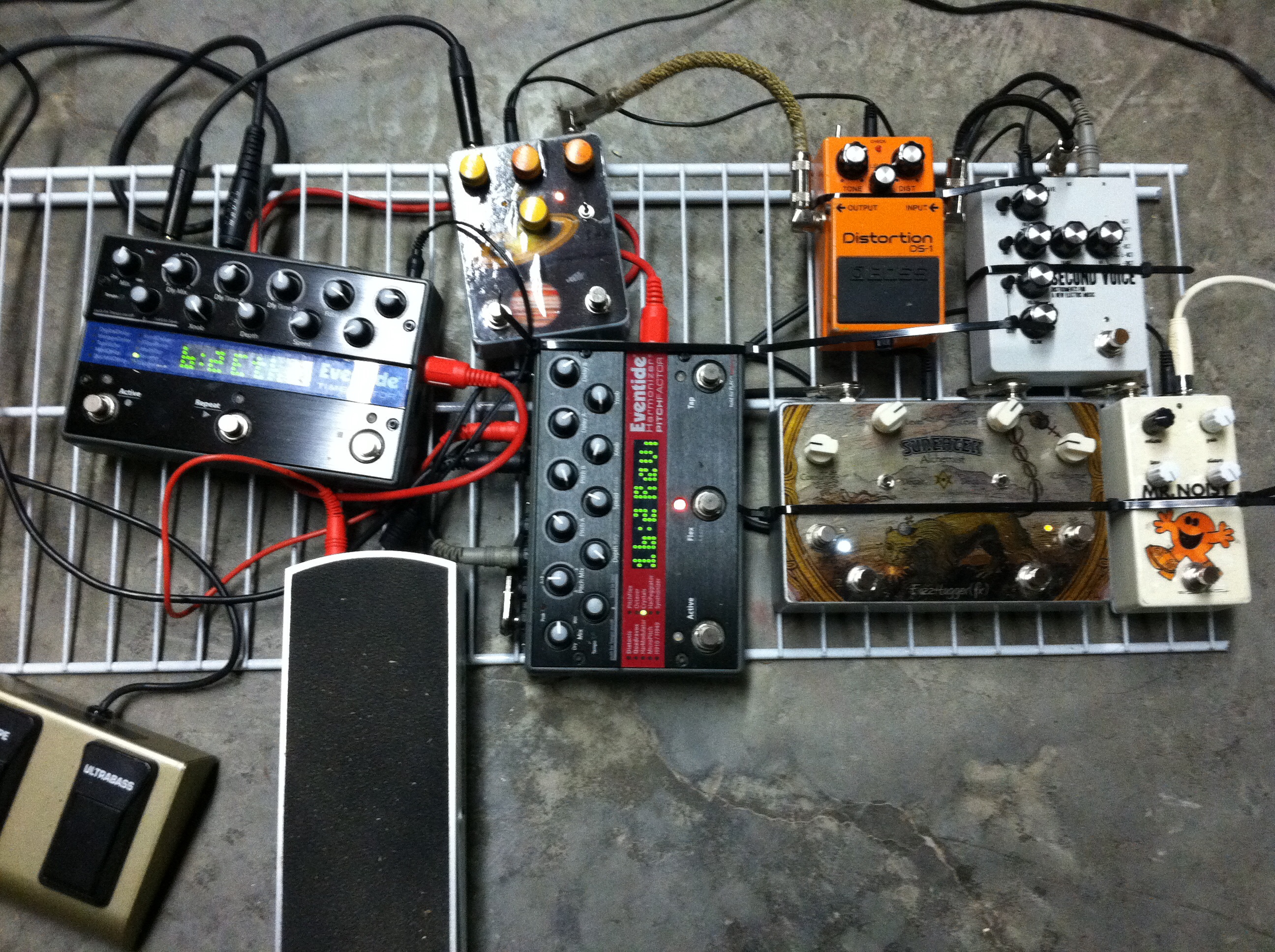 Snazzy Fx Tracer city > Dwarfcraft The Internet OD > Snazzy Fx Mini-Arc > Shin-ei fy-6 Superfuzz > Interfax Harmonic Percolator > Lightfoot Labs Goatkeeper mkII > Moogerfooger Phaser > Koma bd 101 set to deconstruct bits > Moogerfooger Delay. moog ep-2 for feedback on delay, and amount on phaser. enjoy![]()