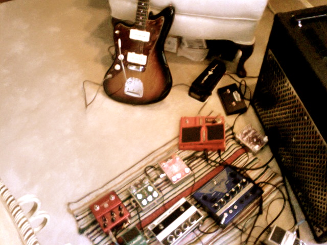 Jazzmaster > Compressor > PS-3 > Timmy > Peachfuzz > RE-20 > DSD-2 > JC-120. With expression pedal into the PS-3 and an iPod into DSD-2.
