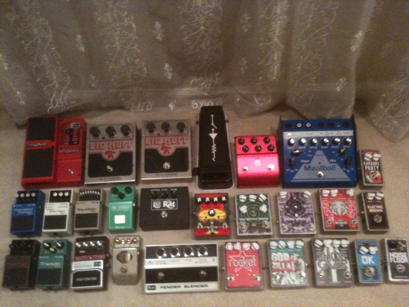 I change pedals around way too often to actually place stuff on a board, but the picture on the bottom is a recent mix of toys i've been using.