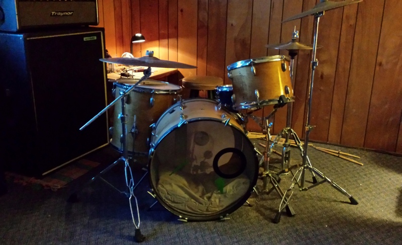 my drums. late 60's gretch round badge. shitty 12x5 snare. sabian xs20 ride (loud and hasnt broken on me yet). other broken cymbals. tama iron cobra. remo vintage emperor heads.