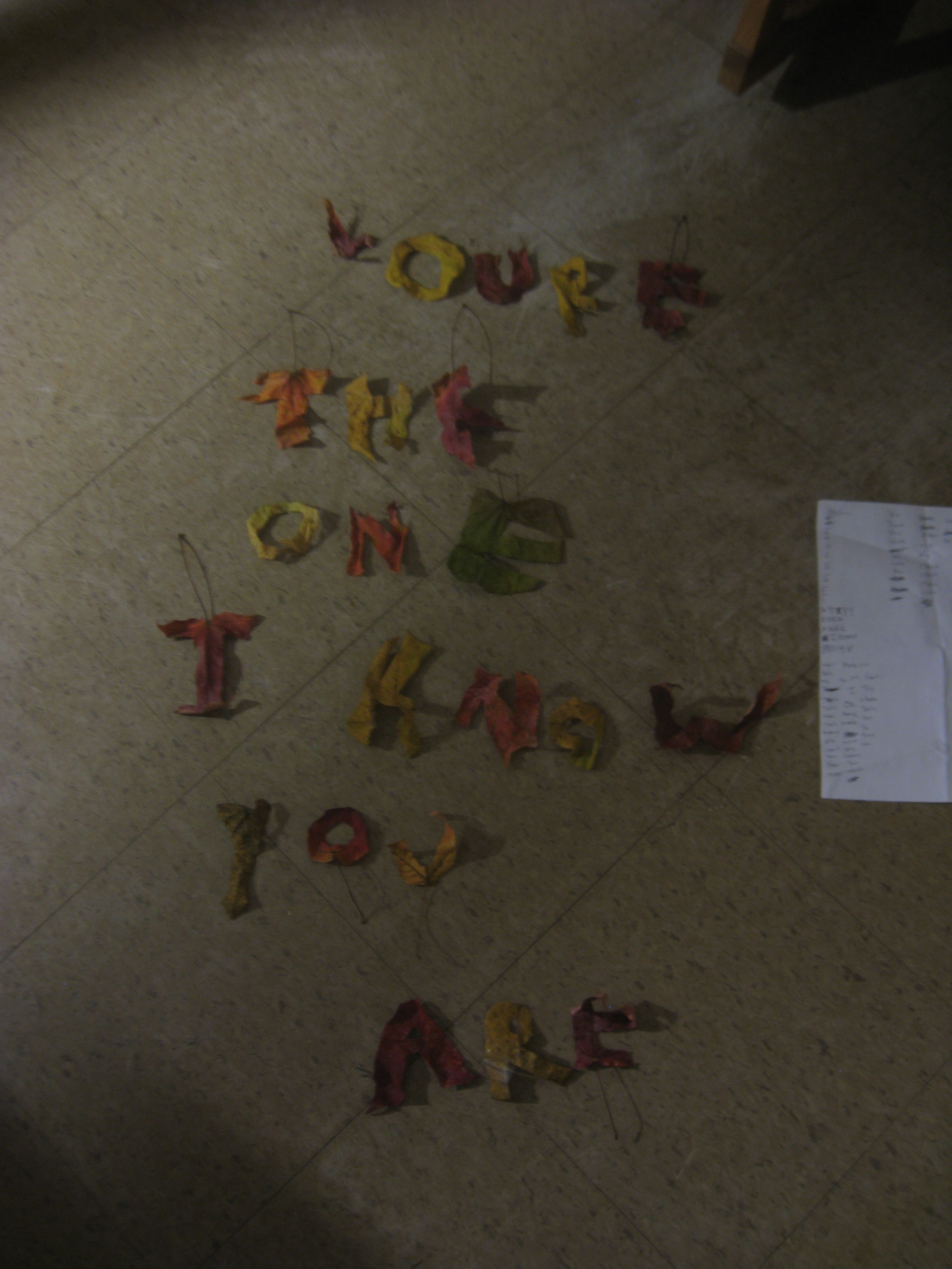 Yesterday I received a box of leaves in the mail from my girlfriend. Some were cut into letters for me to decipher a message. The only hint I had were that colors alternated. After a few hours, I cracked it. These are lyrics from Anthony Green's "Babygirl"; I showed her the song like a month ago and I thought she was just like "ok, that's cute" or whatever, and even if that's all it was the second I figured this out I just felt so happy and had a goofy grin on my face.
