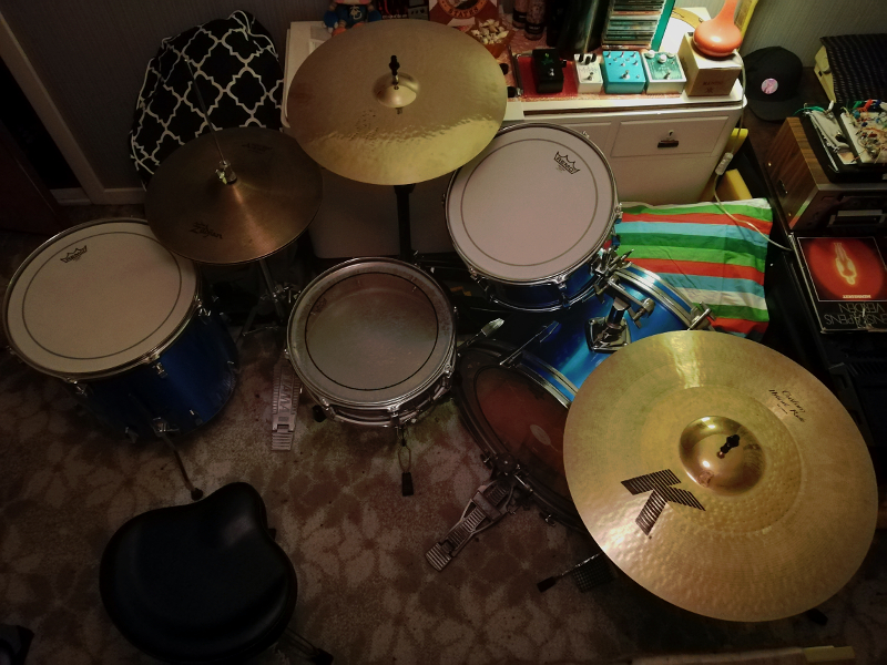 Hey, so it's just a preliminary setup wedged between a bed and a dresser, but this is my kit right now. Inching towards something I feel comfortable playing. Couple new heads, hardware is tight, only thing that's really missing is a bottom ring and resonant head for the floor tom, and a kick res. head. Also a lil arm for an 11" Hybrid Splash is incoming, to fill out that gap between the ride and tom.