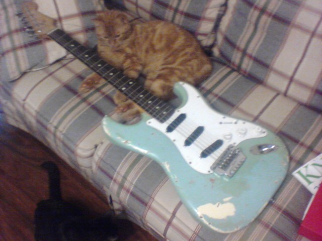kitties and my frankenstrat with lace sensors getting all snuggly. this thing is almost 30 years old.