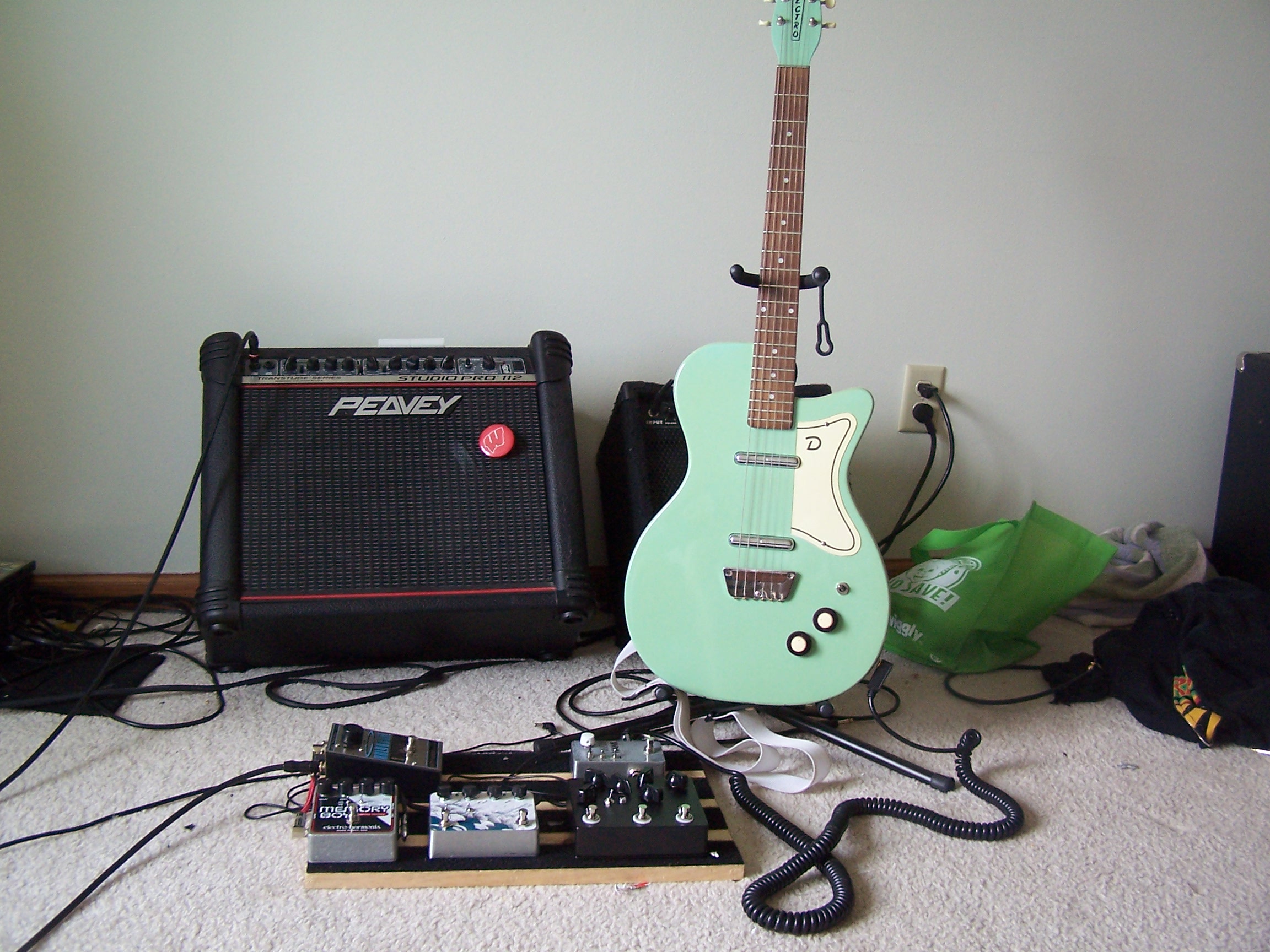 here's my current main guitar. 90s Danelectro U2 reissue. Original color was a light blue, but it faded into a greenish color. looks greener in person.