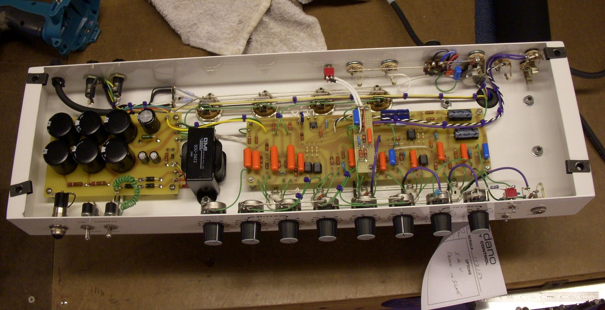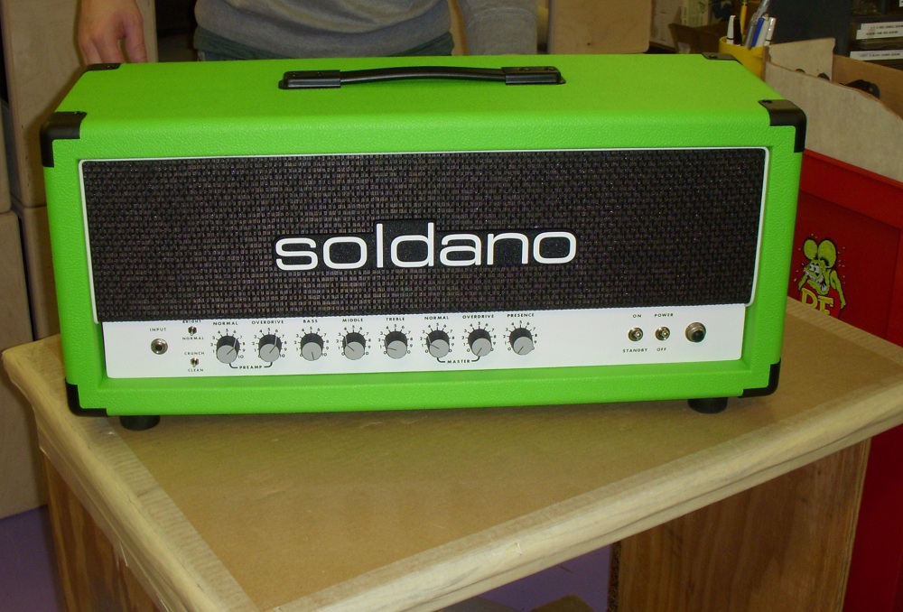 I thought today'd be a good to day to get out and about and post somewhere other than the Doom Room. This is my fancy amp. When you see it you'll think I must be rich but NO! My DR buddies all know the saga but I'll tell it again because this is a new forum for me. I live around the corner from Soldano and one of my bestest bros of all times is the guy who does their tolex and such. He let me borrow his SLO which has the depth mod. It was the best thing I ever played through in my life so I had to get one somehow. Well Mike gave me a bit of bro-down deal and also let me get on a payment plan. Because he's a saint! So I paid and paid for like a year or more. Then my finances went to shit and I couldn't pay for like six months. At the end of that six months we took a show with his band The Industry People. I was raging a mig100 and a Pharaoh at the time. So we blew that place up just like the rest and when we were done the first person to rush the stage all aglow was Mike. He said, "We need to get you that amp man! Come by the shop if you got time and we'll see about putting you to work.". So on Monday I went in and was assigned to build footswitches. I built like 115 of 'em or so and then there was no parts left so I got put on cutting pot shafts. After that I was allowed to install my transformers, tube sockets, etc and also build my super secret SRV mod board. Then it was left in the capable hands of one Don Blair (guy who builds most amps and all of the SLO's). Do I even have to say this thing is a beast from outer space?