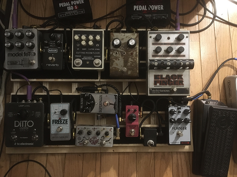 EHX blackfinger > RMA Tetanus Booster > CRF > MXR reverb > model feT > volume > ADA Flange w/ exp > T1M stutta kill switch > Ibanez mini delay > supermoon> sonar tremolo > ehx freeze > ditto