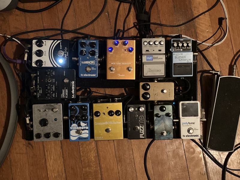 Ernie Ball VP Jr. -> TC Polytune -> 70s MXR Distortion+ -> Fuzzhugger FX 3-knob Great Wall ->Catalinbread germanium Fuzzrite -> EMMA Discumbobulator envelope filter -> Mojo Hand FX Villanova optical Uni-Vibe -> Fairfield Circuitry Randy's Revenge v.1 -> TC SCH chorus/flanger (always in flanger mode) (carriage return) -> Boss CH-1 chorus -> Ibanez PM7 Phase Modulator (wonky phaser) -> Fender Marjorie Taylor Greene Tube Tremolo -> TC Flashback v.1 delay -> Earthquaker Ghost Echo v.1 reverb.