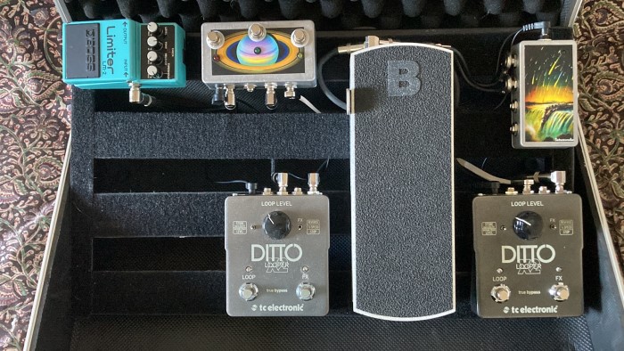 front-end board signal path (left): EXH Octave Multiplexer (for bass parts)->EHX Attack Delay with Moog expression pedal->effects loop of Attack Delay->Fairfield Circuitry Shallow Water modulator->Ibanez LF7 Lo Fi->Zvex Instant Lo-Fi Junky->loop return to Attack Delay->Attack Delay output with envelope when engaged->Boss RV-3 reverb/delay.