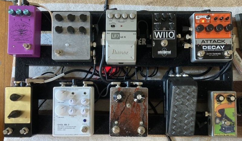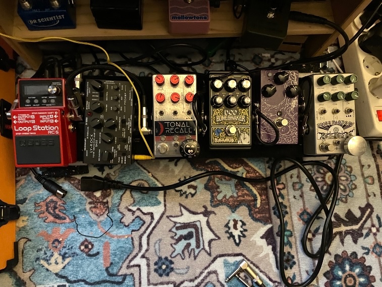 Mxr octave > red witch tremolo> Heather Brown Electronicals The Blessed Mother> Sentient Greenseer Brassmaster Fuzz> smoke’s amp co Ezekiel 25 clone> wrenandcuff super Russian> mutron 4> boss vb2w > Mxr phase 95 > maxon ad900 > maxon rt600