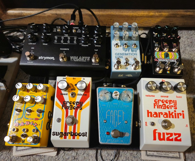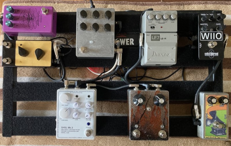 Mellowtone Hi Five clean boost->Catalinbread WIIO v3 Hiwatt emulator->Ibanez LF7 LoFi->Stomping Stones Virus->Analog Music Co. So High So Low high pass/low pass filter->Fairfield Circuitry Shallow Water modulator->(Wardenclyffe Mini goes here)->Fjord Fuzz MIME reverb->Farm Pedals Expanding Universe reverb.