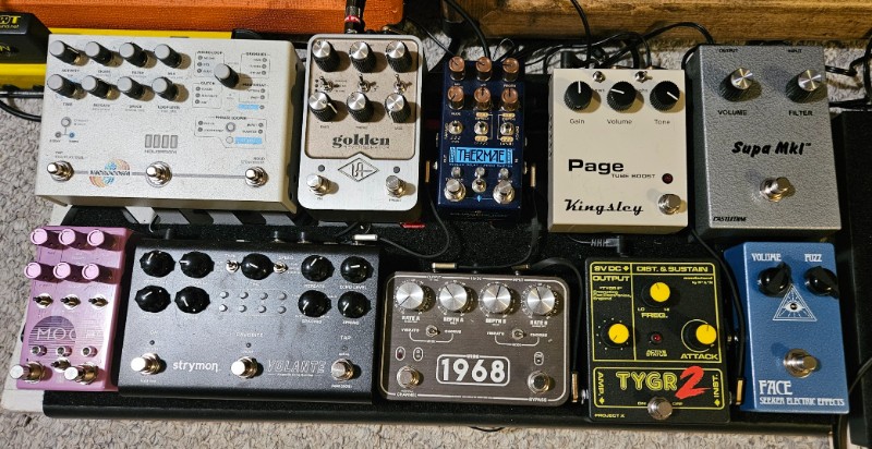 TC Electronics Polytune v1->EMMA Discumbobulator v1 envelope filter->Marshall Guv'nor Plus OD->Höfner Fuzz->Danelectro 3699 Fuzz->Empress Nebulus multi-modulation->Fender MTG Tube Tremolo->EQD Ghost Echo v2 reverb.