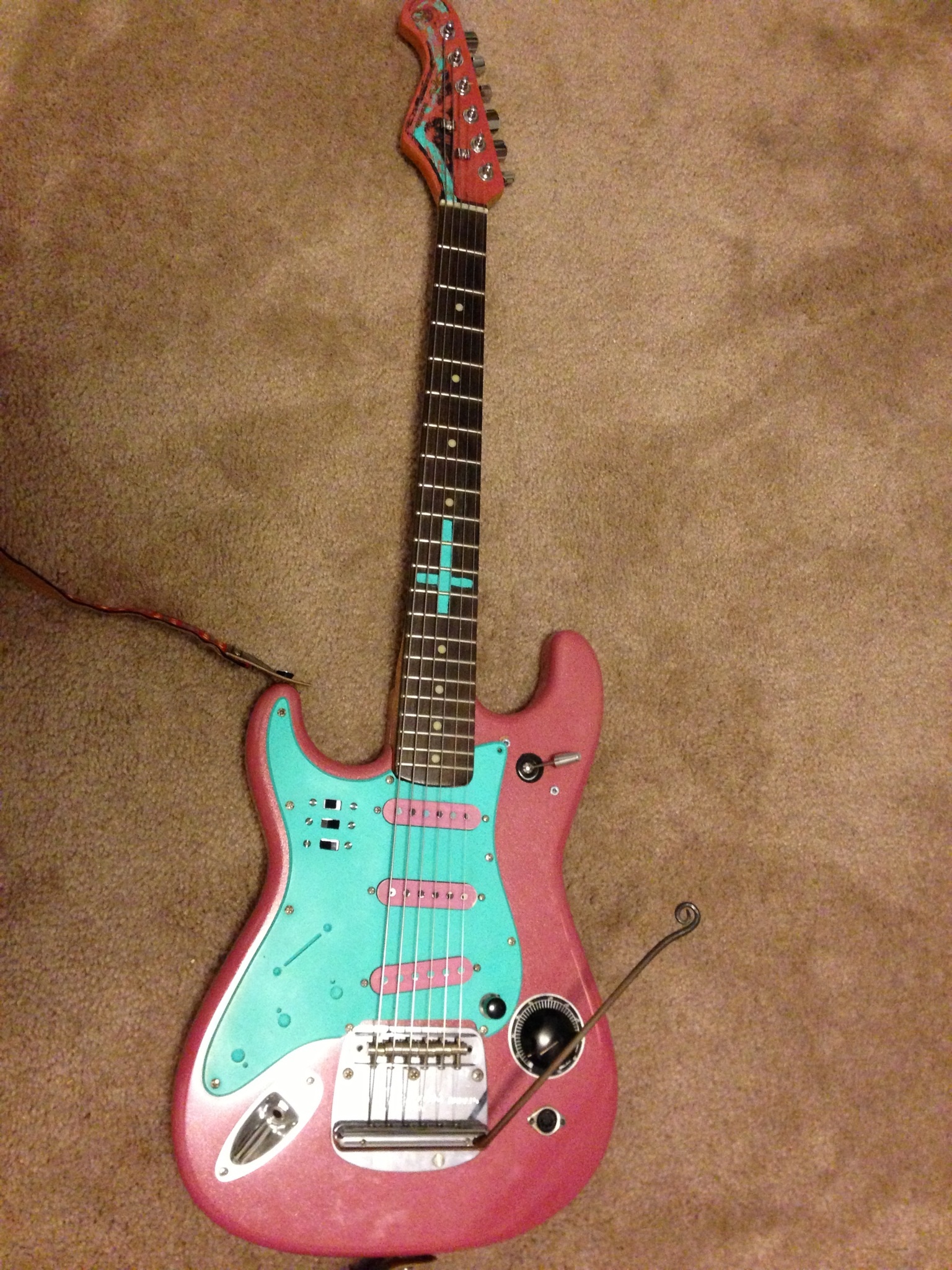 My strat, 24" short scale sx lefty turned righty, mustang trem replaced original lefty strat one (saving that for a future project). Individual on/offs for each pickup, only volume knob (the big one), killswitch, joystick wired to be two expression pedals, goes to the midi jack (not currently working...)