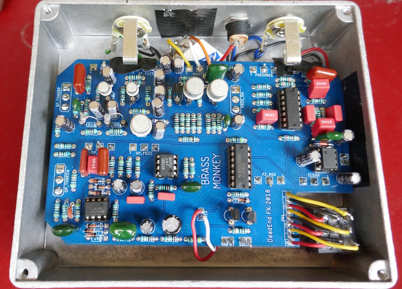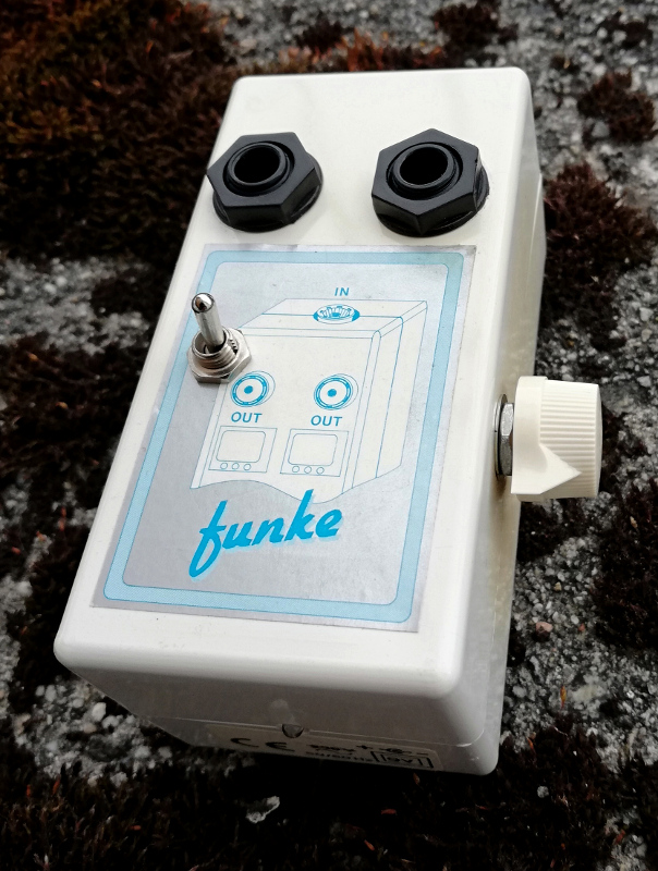 Features non-stompable 3PDT (perfect fit in pre-existing hole), color-matched knob, true top mount jacks, doggystyle power and frontlight LED. Unmodded build, but the one tropical fish NOS output cap that of course makes this sound 10x better. Naw, but I really like this for a one-knobber. It's more like a distortion, good for rhythm, but it has a bright, kinda slimy silicon fuzz character too. Funke.
