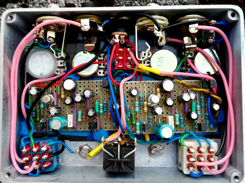This dual Schaller tremolo here turned out a little strange visually, I guess it's the closest I'll ever get to a patriotic pedal, with the red, white and blue. Wish I had mirrored the knobs maybe, but overall I'm happy with the layout and ease of use. Only small mods I did was add a 1.2m pulldown resistor, slightly increased input impedance (why?) and a switch on each of the depths to lift the ground, thus cutting out the valley of the wave for a hard-chopped albeit quieter trem. Not a brilliant mod as the Schaller is choppy (chopper-y even) enough already. Volume drop doesn't seem too bad. Transistors are BC170 with a BC109C at the end. Middle switch is for the trem 1 speed range, which probably should generally be set to fast because in slow mode the last 10-20% of the speed pot flattens out the wave and you just get volume reduction, esp with depth set high. That's the only obvious flaw so far, or well the range/smoothness of the speed/depth pots is not perfect, should have selected them more carefully maybe. Does what it's supposed to tho, which is being two asynchronous tremolos in one box to run both sides of my stereo signal thru.