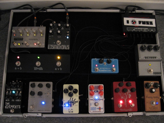 Keeley Overdrive<Walrus Audio Voyager<Tim clone<Gatekeeper Fuzz<Ibanez TC10 Twin Cam Chorus<modded Boss TR2 Tremolo<Boss HR2 Harmonist<POG2<Boss DD6<Boss RV3<EHX Cathedral<EHX Stereo Memory Man< Boss TU2< Ernie Ball Volume Jr.