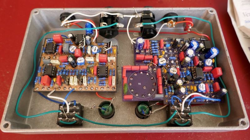 I made some minor cap additions and value changes, just for noise control and tonal adjustment, but it's basically the same as what Jimi published all those years ago. Using a 7660 to provide bipolar power for the PNP's and the MPSA18, and also allows for use of a daisy chain without the polarity issues. Using relay silent switching as well. With this much gain in the tank, I didn't want to have to deal with possible switch clicking, so I decided to address it from the get go. Something I always wanted to build, but kept getting side tracked. Also the first vero I've done in eons. Overall, pretty pleased.