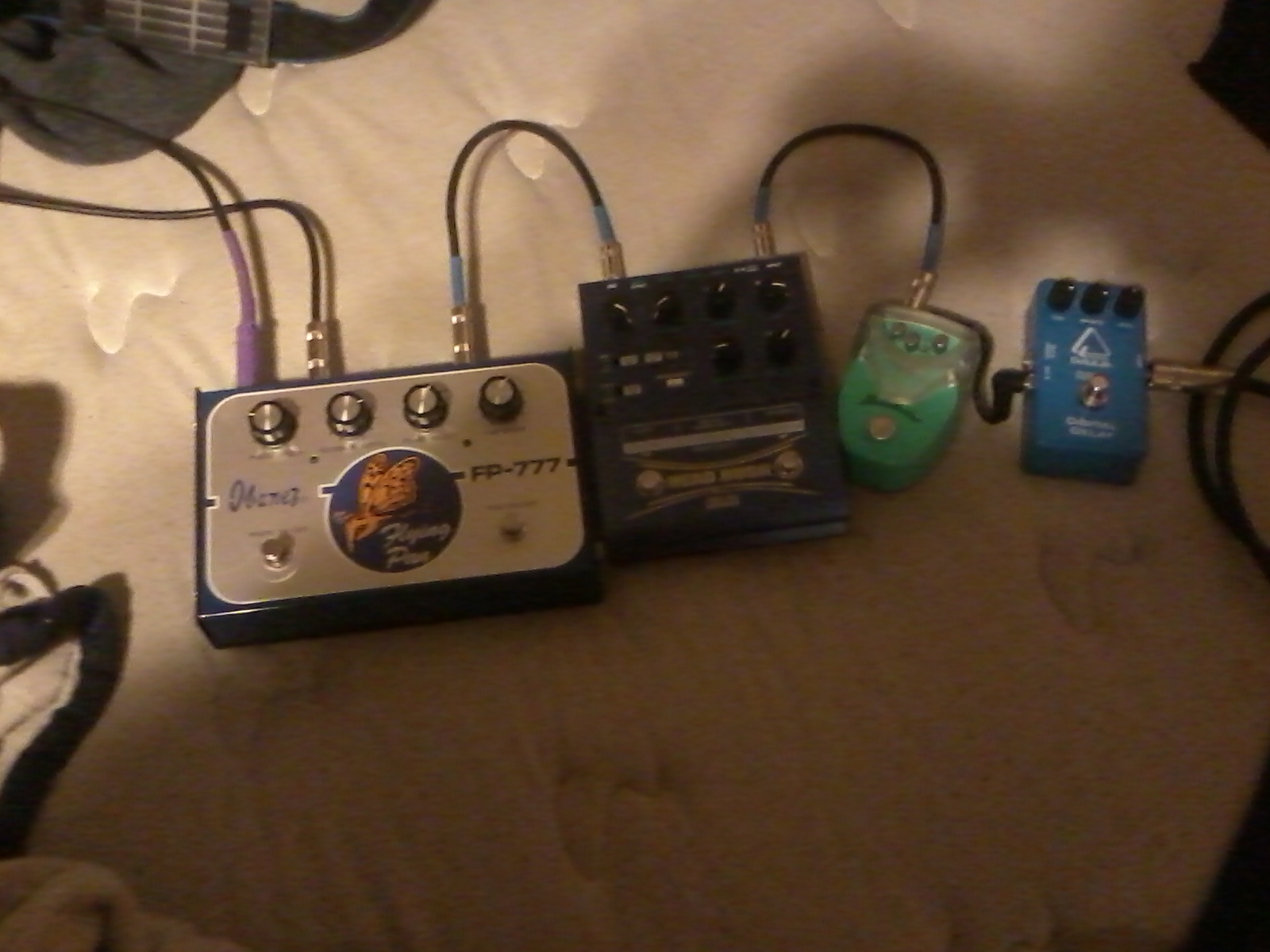 Right now I stack the muff into the black plague for some seriously huge riffage/drone guitar work. When my volume knob is at 1, I get some weird ass radio interference. I was using the delay as a very strange metallic filter with the feedback maxed out and the delay time very short, but the ring mod might just be the thing i need for that. The shoegazer stacks on top of that for some searing octave up solo sounds and ugly noise.