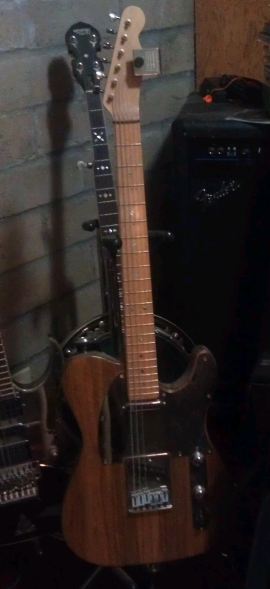 I have dreams of making a 7 string multiscale telecaster, with a pointy headstock, probably cedar body and maple on maple neck, with a walnut strip down the middle. I have a couple of pieces of flame maple I cut to fingerboards size..