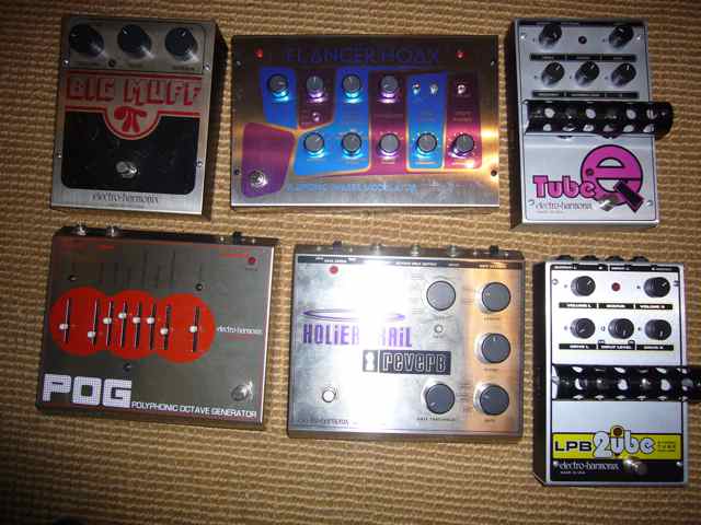 Big Muff, Flanger Hoax, Tube Q with Telefunken NOS tubes, POG, Holier Grail, 2ube preamp with Telefunken tubes