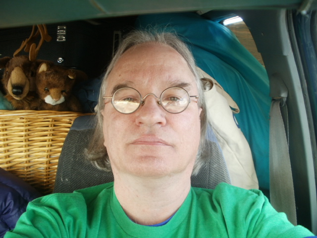 at the Alpine visitors center in Rocky Mountain National Park; Rave Kitty is my co-pilot. note guitars behind the stuffed animals in the background, literally stacked all the way to the ceiling in the middle seat