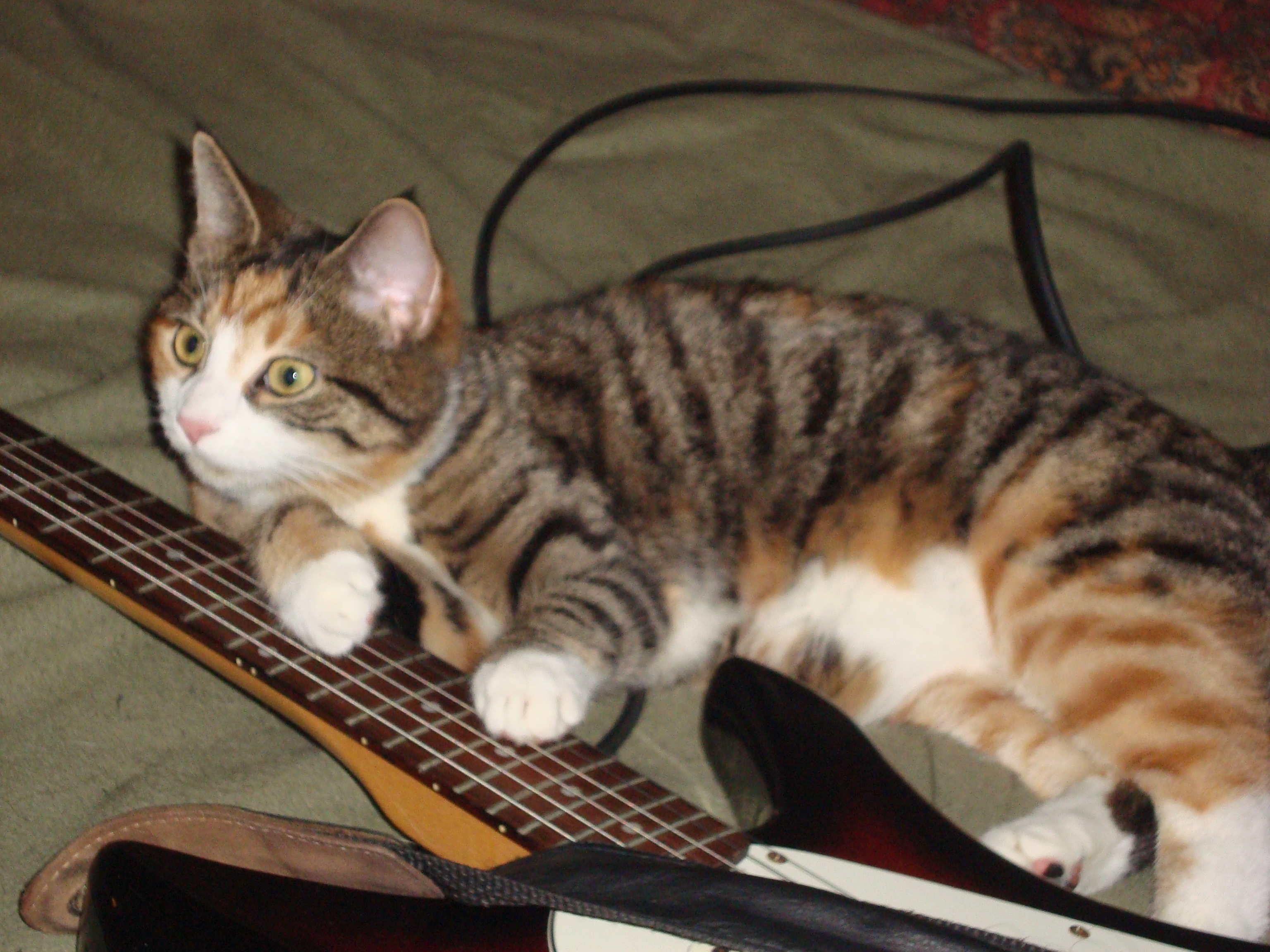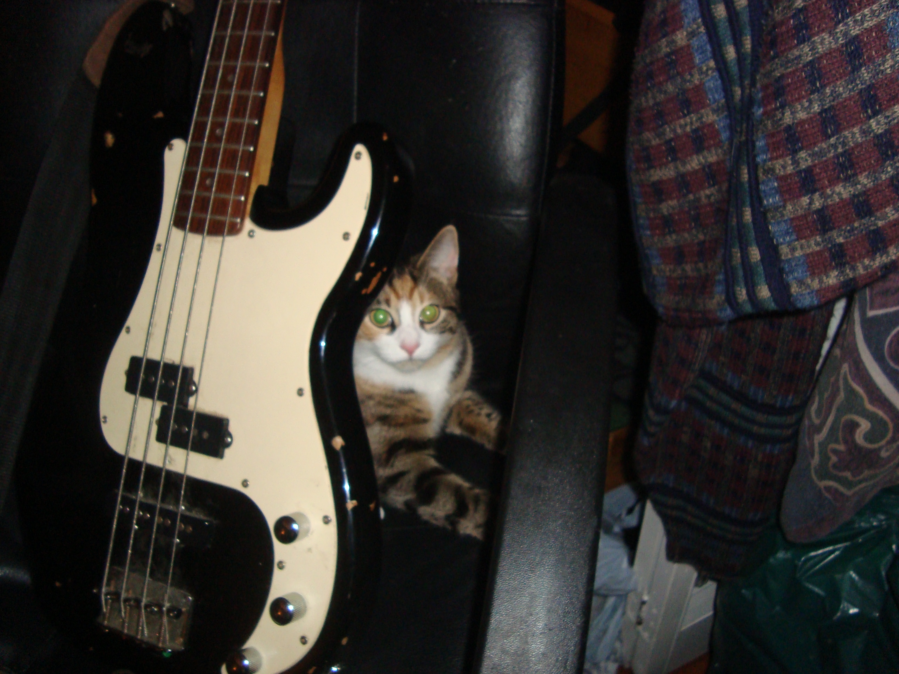 here are my two maine coon blend cats "T.J" rocking my P-bass and then the Xray.