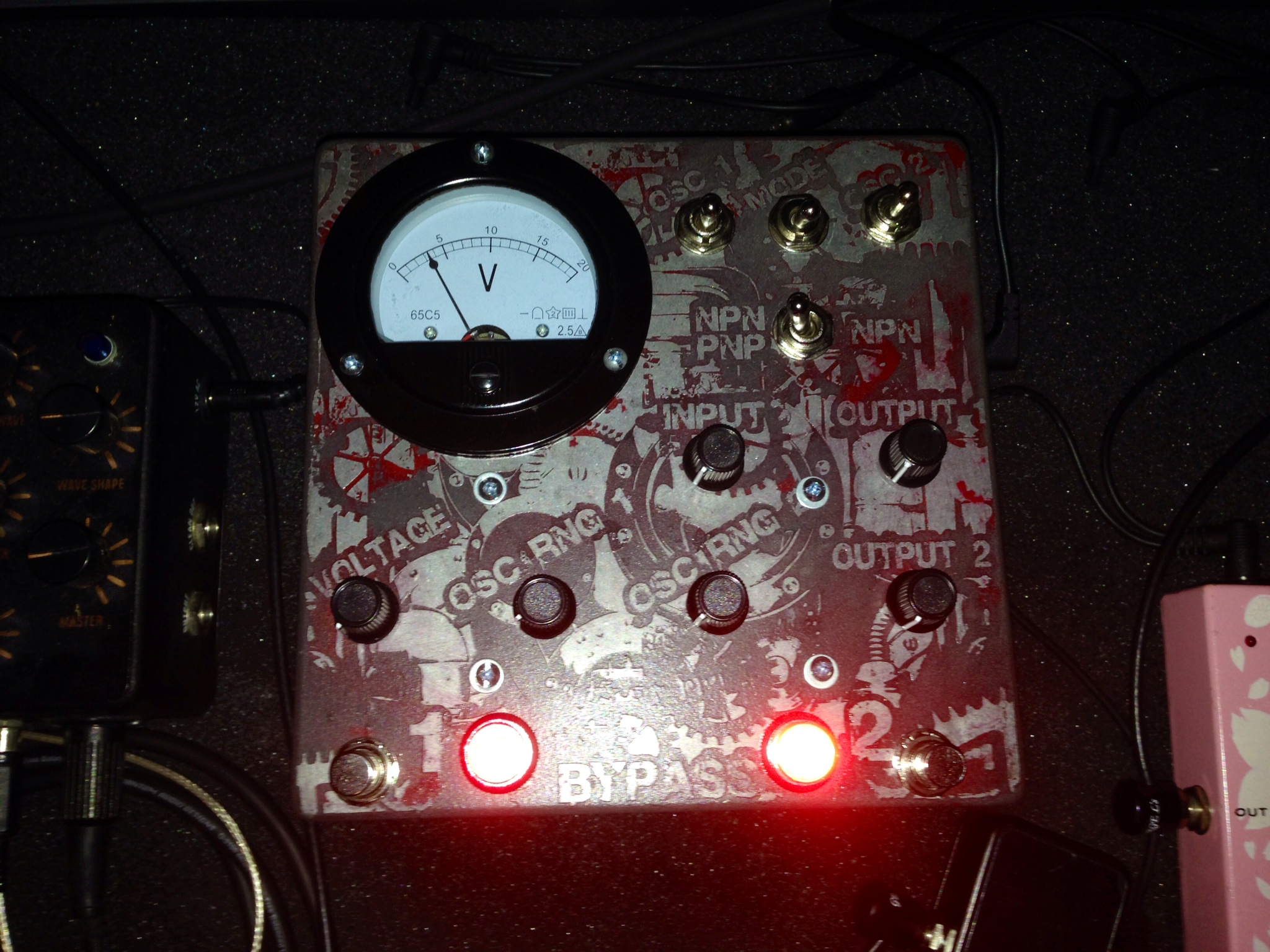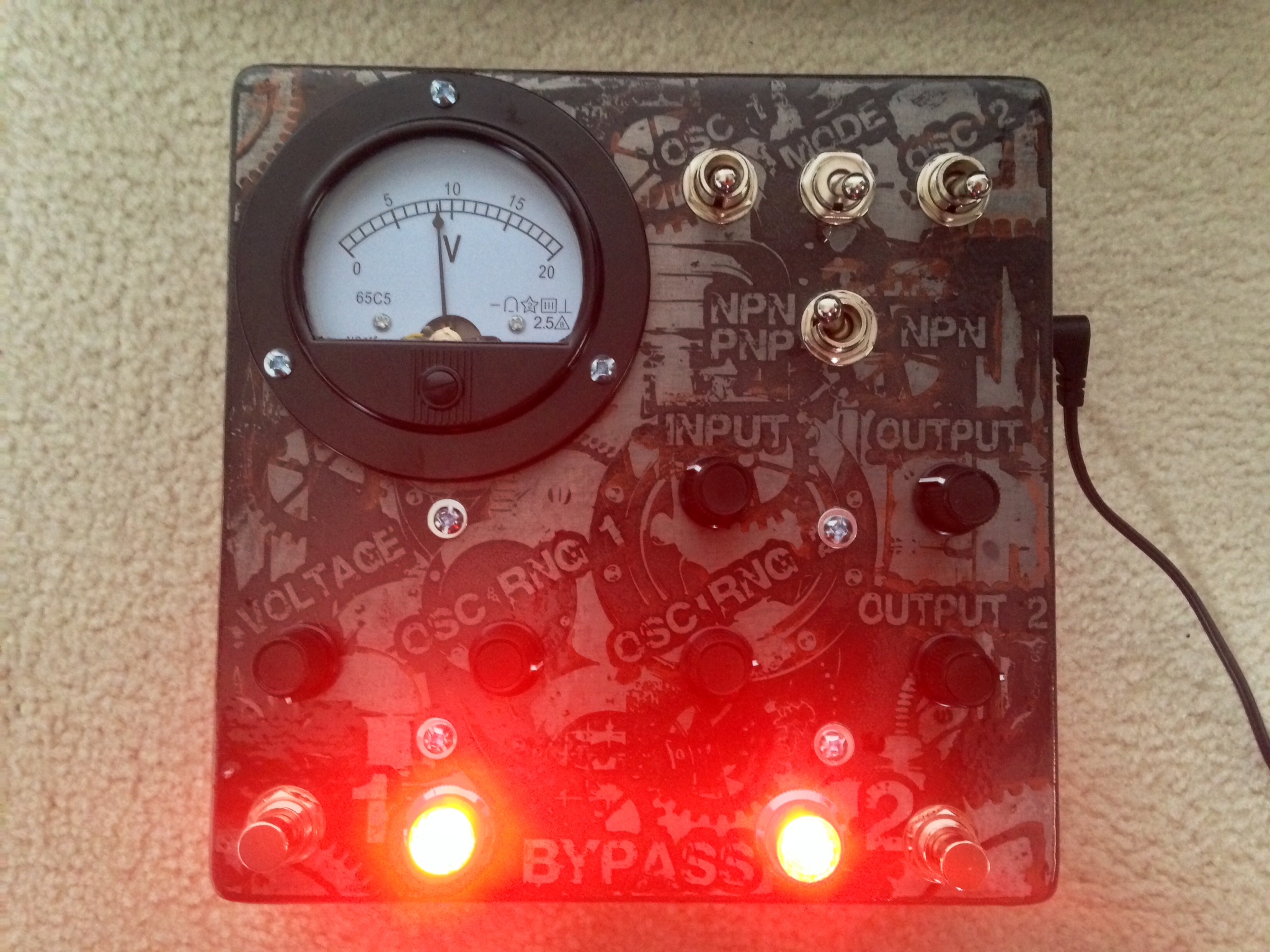 The original one is the Deluxe version with a Voltage meter, industrial switches, big shiny jewel Lamps, and sweet ass original old school military radio knobs. I now have the smaller version available pictured below with all the same sounds but it doesn't have the added bonus of the voltage starve, meter, separate in's and out's, and the fancy big knobs, switches, and jewel lamps