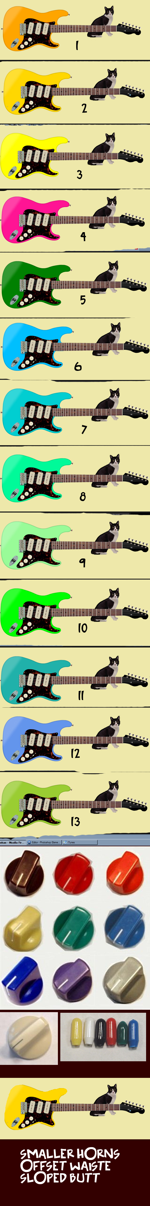 I have a pretty ugly Silvertone Revolver (strat rip-off) that I want to breathe some life into. I have pretty well settled on a tortoiseshell pickguard and 3 p-90 soapbar pickups from mighty mite. From the reviews i guess they are pretty decent sounding, but they hum a lot. Which is okay by me. I am also going to trim it down a bit to look less strat-like and more cyclone/jazzmasteresque. (see last image) I want to totally strip and repaint this thing, but i have no idea what color. Well actually I have about 13 ideas. Which do you like the best? Also, I want to use the knobs pictured after the guitars. Suggest a knob/switchcap color to add if you like. THANKS FOR THE HELP!